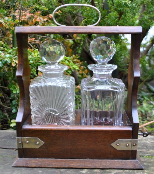 Tantalus of oak with two different crystal decanters with stoppers. England. 19th century