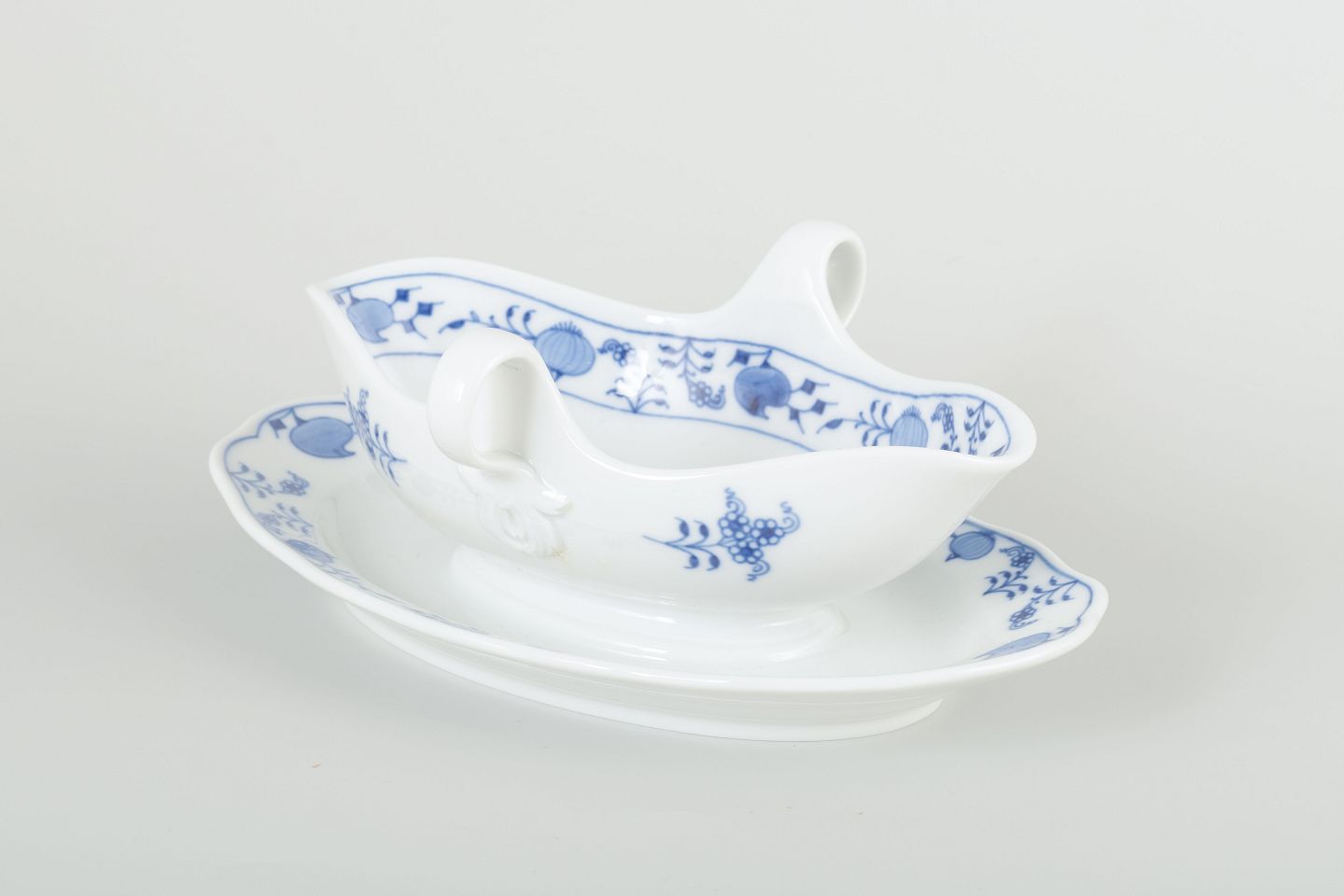 Elegant sovseskål i hvidt porcelæn med fastmonteret fad og dobbelt hældetud. Håndmalet underglasurdekoration i det klassiske “Løgmønstret” (Blue Onion) mønster.
