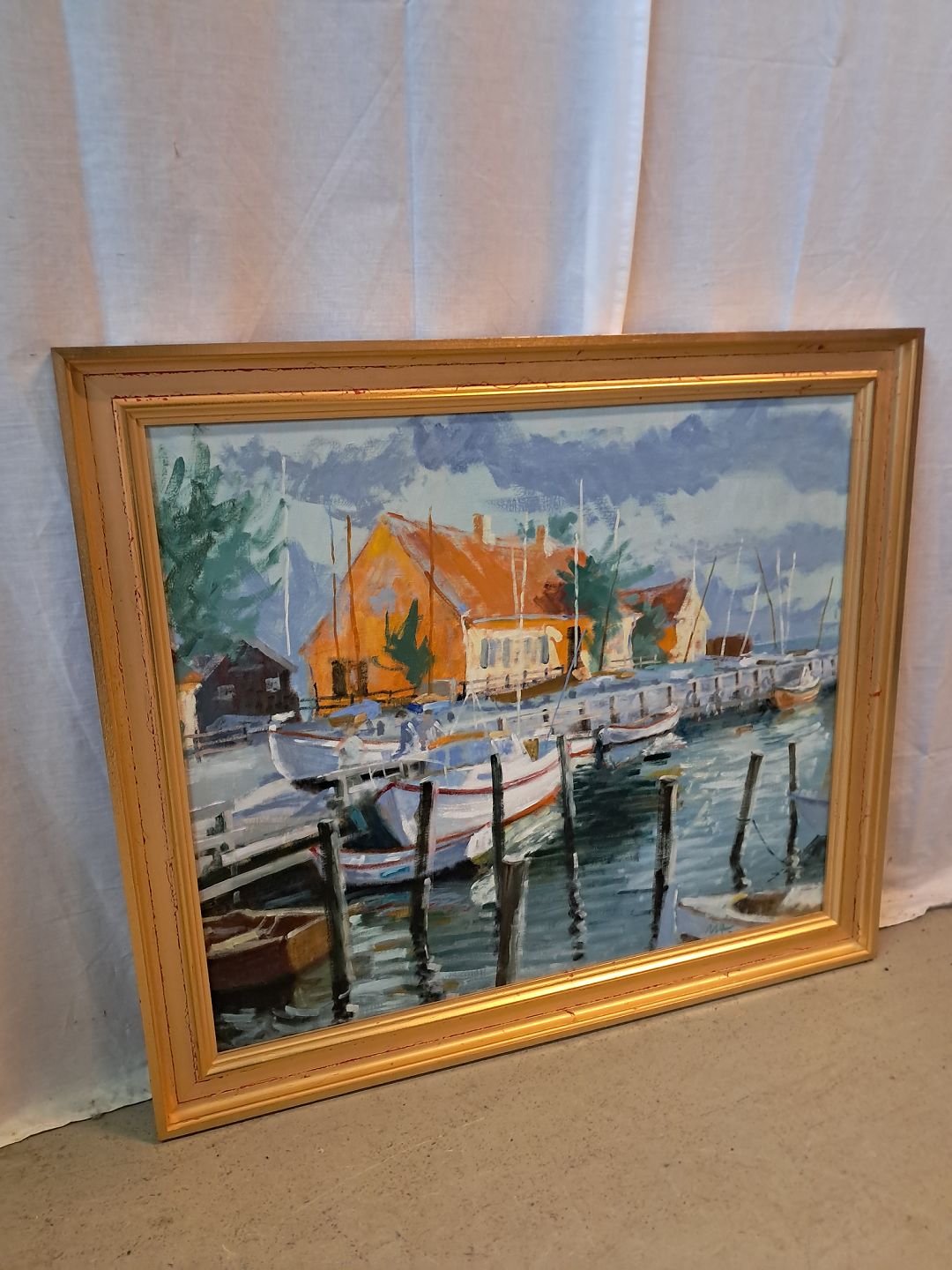 Maleri af Dragør Havn i guldmalet ramme, af : Mogens Amdi Thorsen (1924-2016)