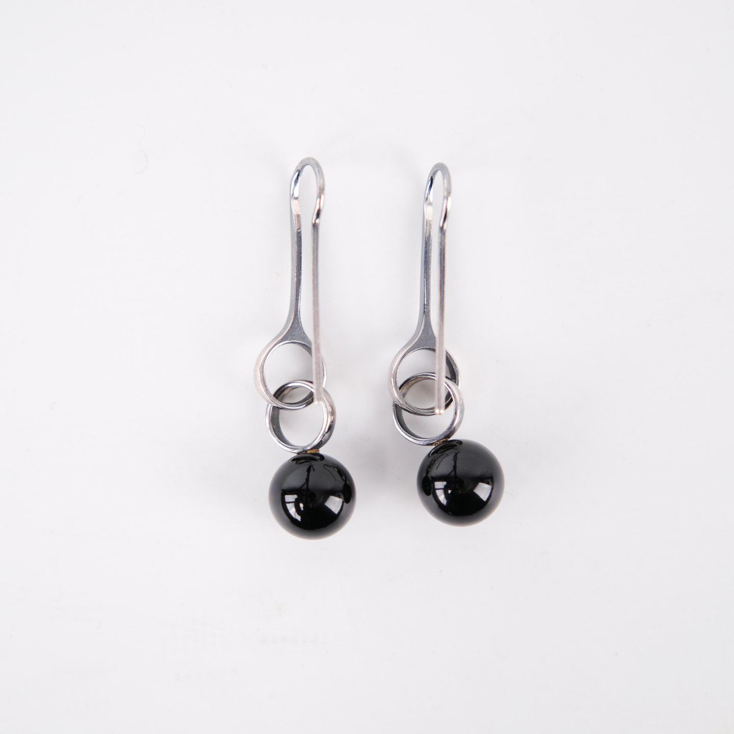 Ørehængere i sterling sølv 925S, stemplet GJ 925 S, designet af Regitze Overgaard for Georg Jensen. Udført som elegante sphere-earrings med sort agat, kendetegnet ved enkelhed, rene linjer og tidløst dansk smykkedesign. Et klassisk sæt i kvalitetsmaterialer.