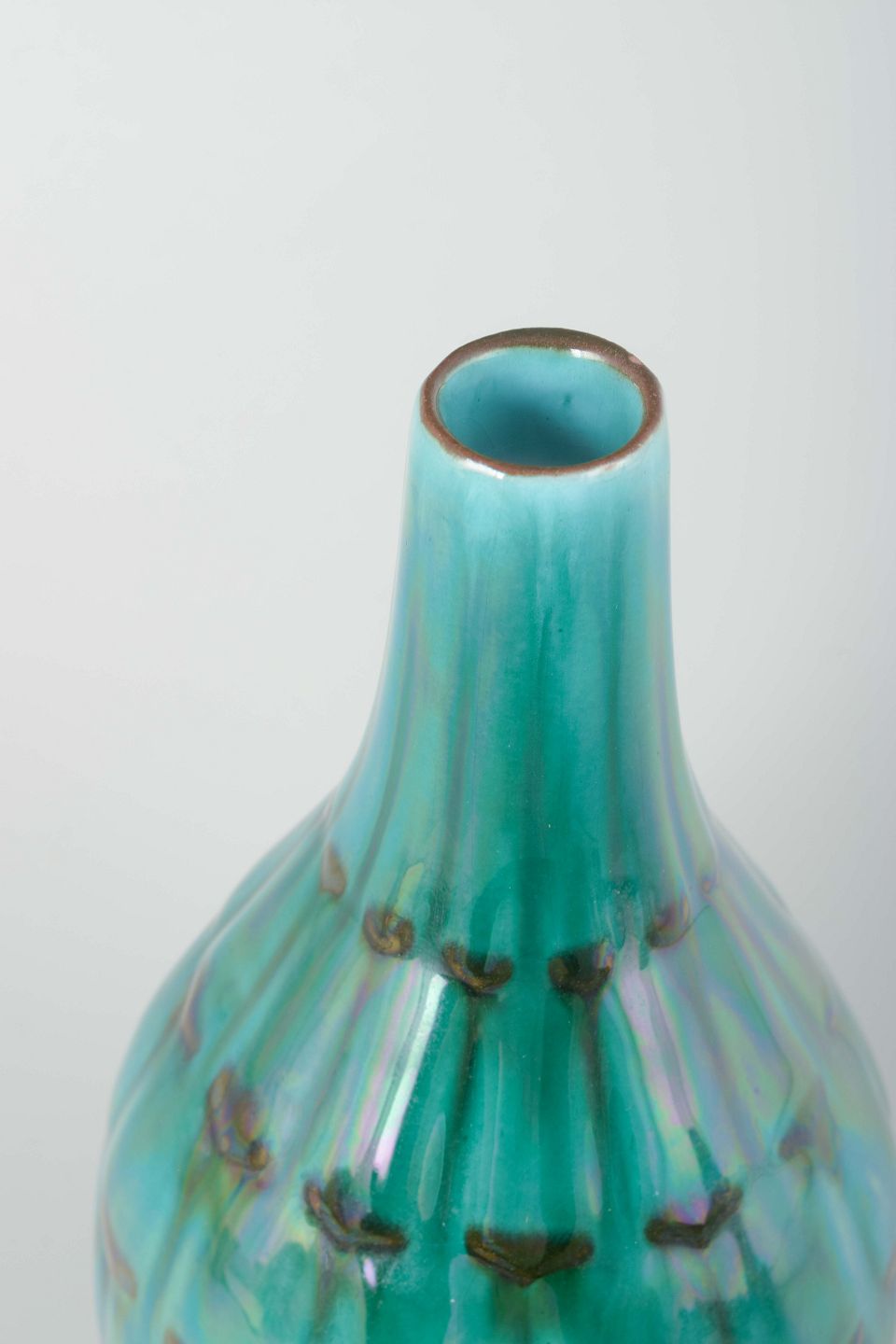 Dråbeformet vase i stentøj med blank turkisgrøn glasur og dekorative lodrette strøg i brunlige nuancer.