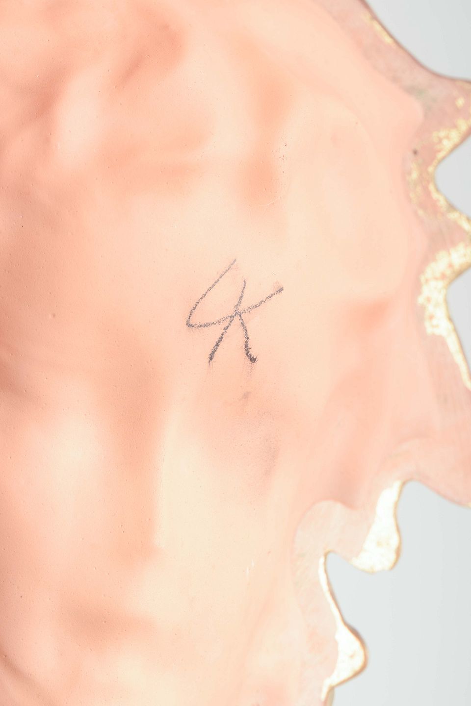 Dekorativt vægrelief i terrakotta, formet som et stiliseret kvindehoved med store øjne, bølget hår og ringformet ørering. Overfladen er bemalet med gylden dekor. Signeret.