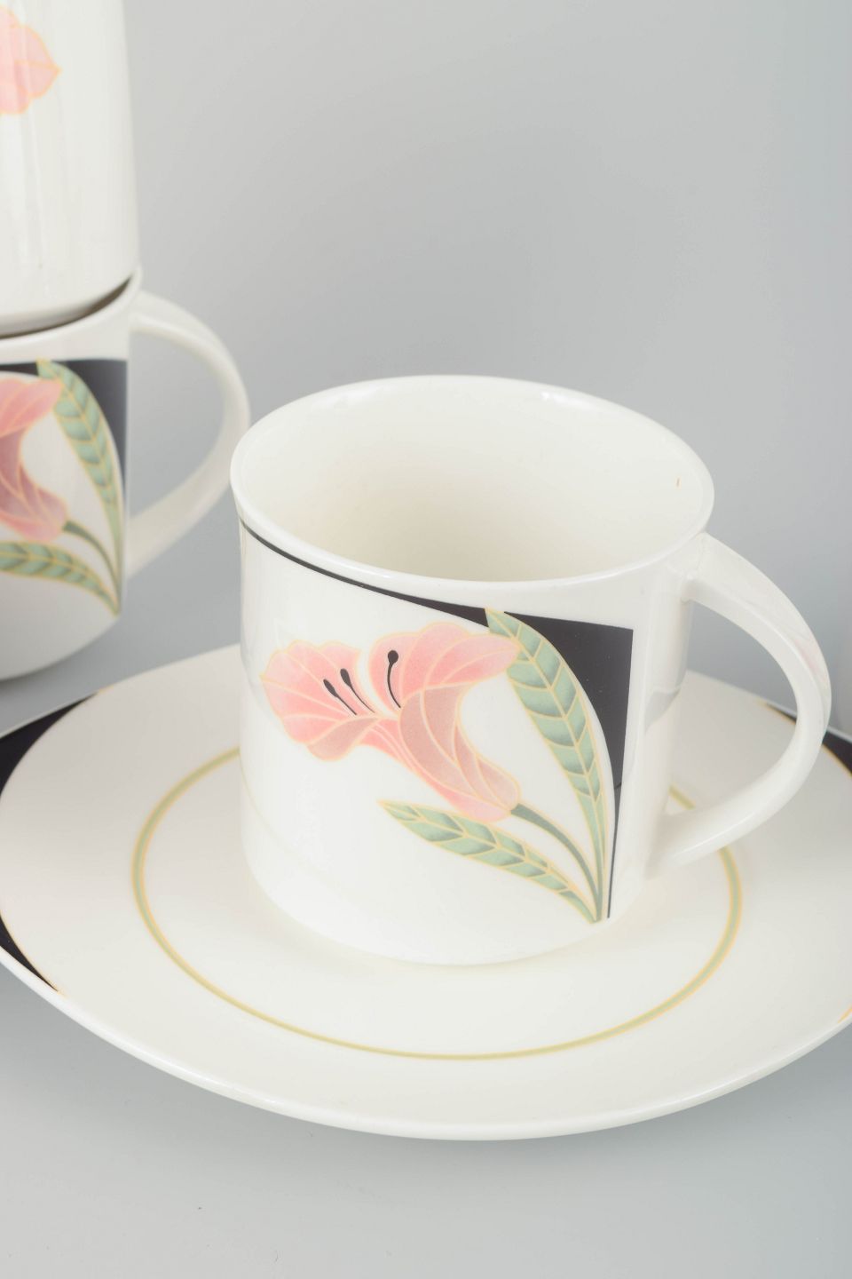Seks porcelænskopper med tilhørende underkopper, dekoreret med håndmalede blomster i rosa, grønne og sorte nuancer. Serien kombinerer rene linjer og bløde former med et elegant postmodernistisk udtryk.