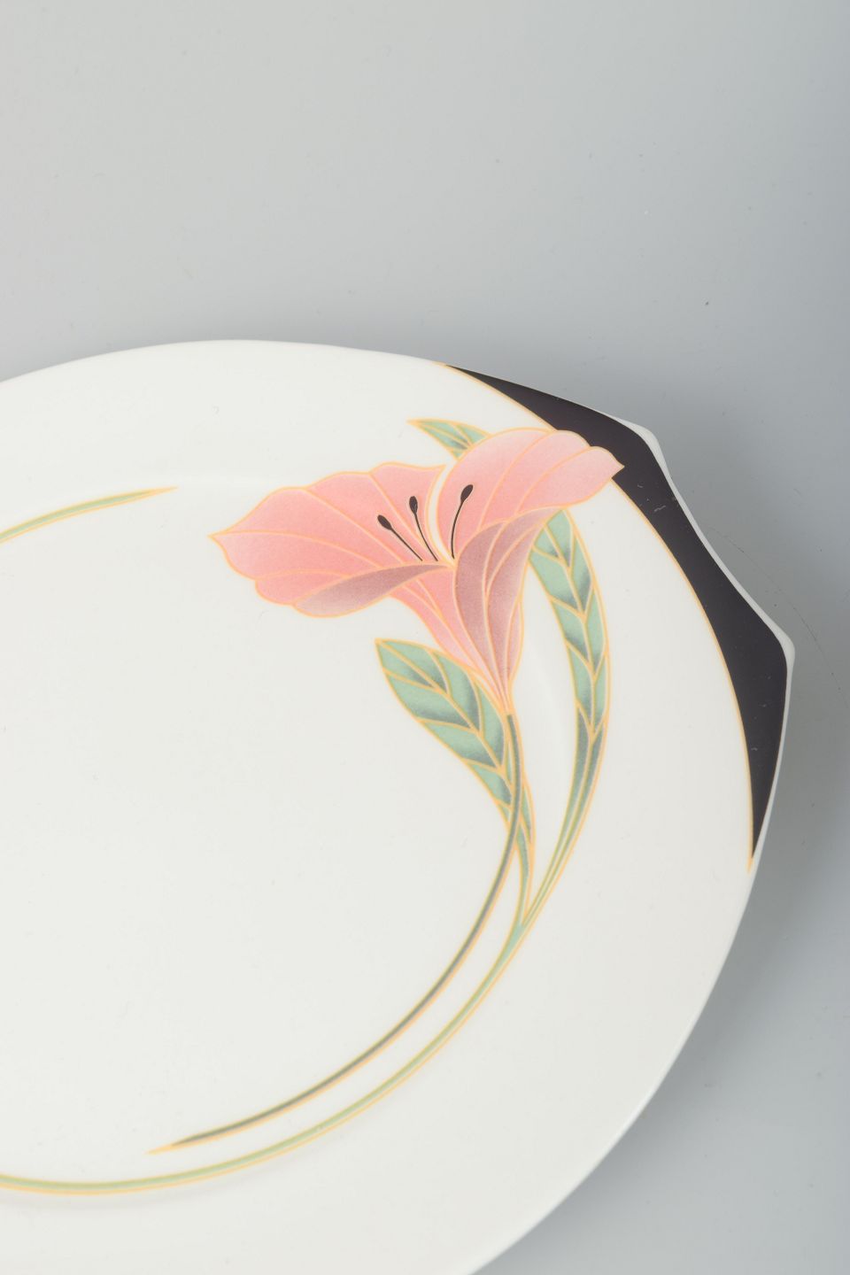 Seks porcelænstallerkener med håndmalet blomsterdekoration i rosa, grønne og sorte nuancer. Serien kombinerer bløde linjer og let asymmetriske detaljer med et elegant postmodernistisk formsprog.