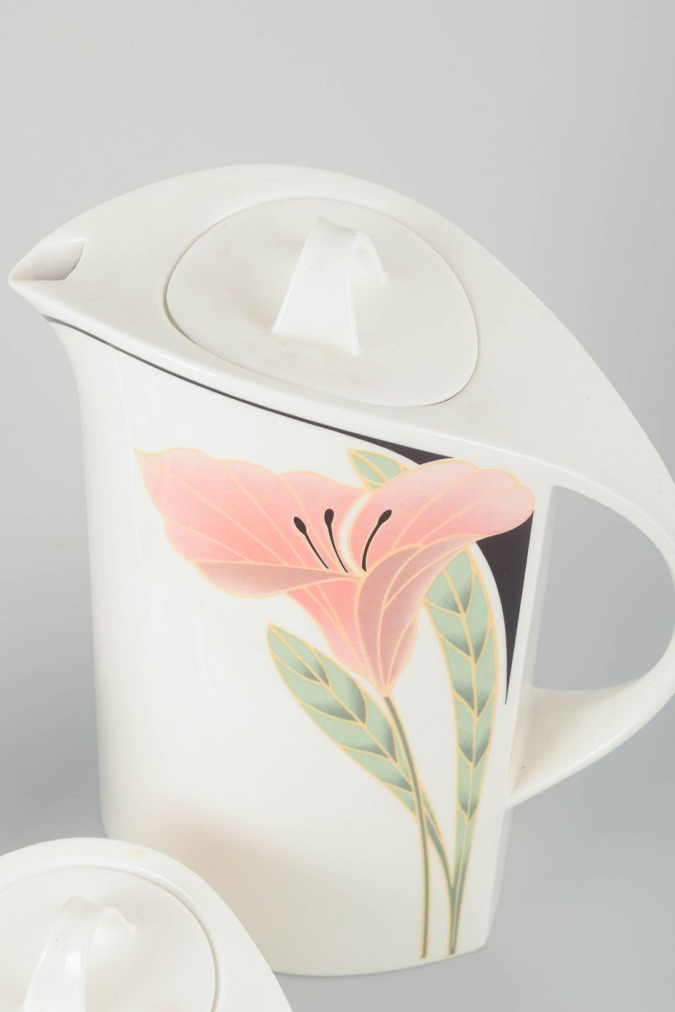 Porcelænskaffekande, sukkerskål og flødekande med elegant blomsterdekoration i rosa, grønne og sorte nuancer. Designet er karakteriseret ved bløde, buede linjer og et stilrent, postmodernistisk udtryk typisk for perioden.