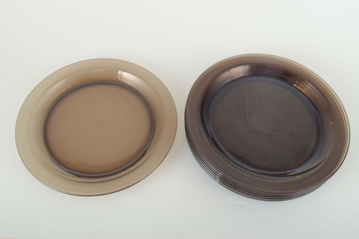 Sæt bestående af seks middagstallerkener i røgfarvet glas. Klassisk fransk design fra Vereco, kendt for sit funktionelle husholdningsglas med enkle linjer og varme toner, karakteristisk for 1970’ernes formsprog.
