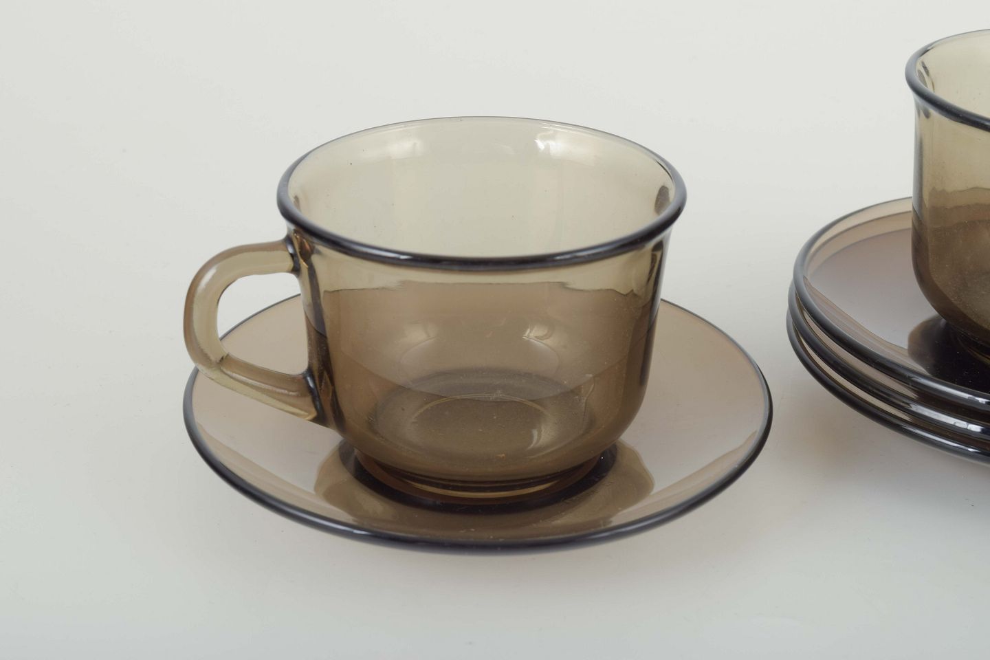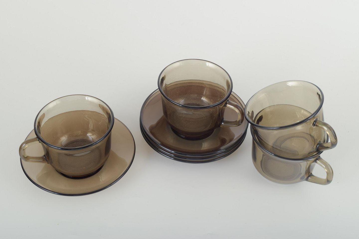 Sæt bestående af fire kopper og fire underkopper i røgfarvet glas. Klassisk fransk design fra Vereco, kendt for sit funktionelle og tidstypiske glas med enkle linjer og varme nuancer.