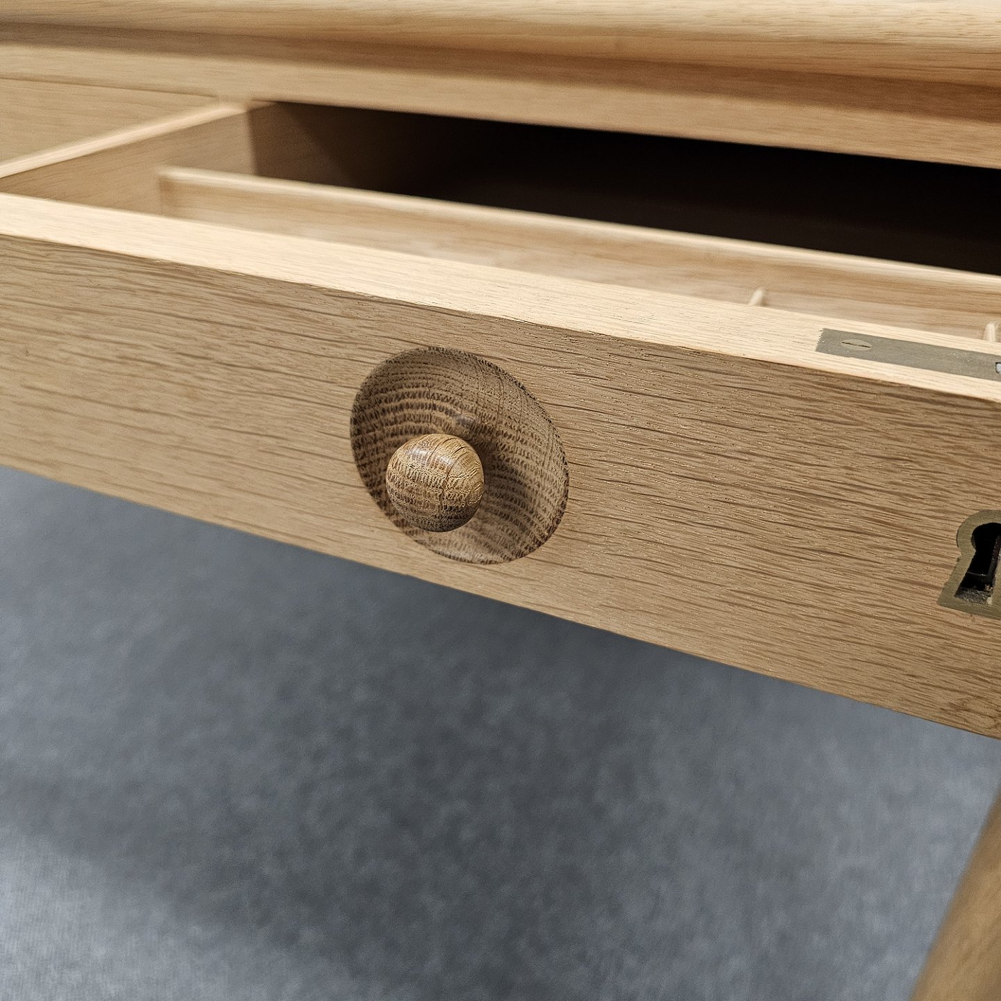 Fritstående skrivebord i egetræ med tre skuffer, højre skuffe har lås og medfølgende nøgle