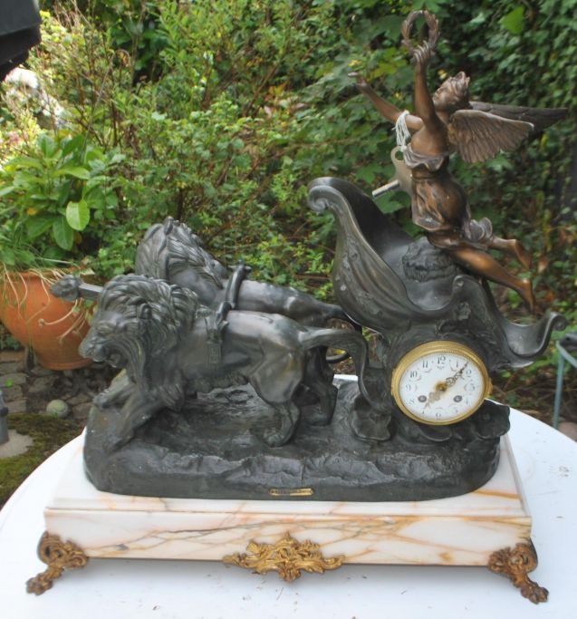 Kæmpe fransk kaminur, 19. årh. Char de la Concorde. Nike - gudinde personificeret som sejren. Zinkur på marmorbase. Nike på stridsvogn trukket af løver. Figurerne er bronzeret.