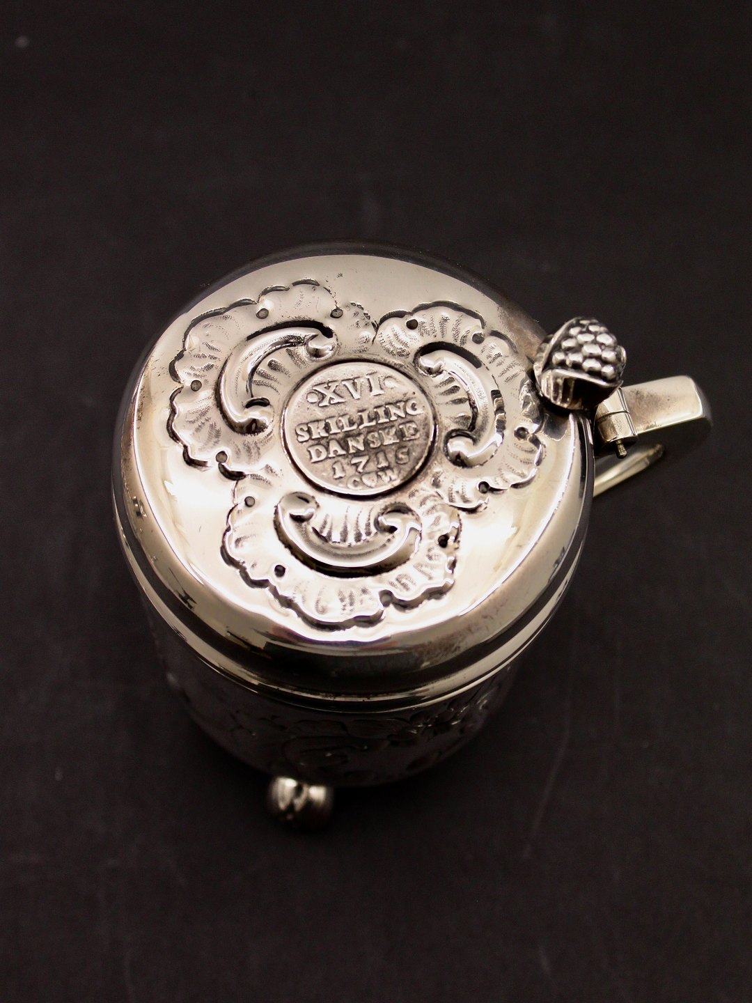 Tretårnet sølv krus med gammel sølv shilling mønt H. 13 cm. emne nr. 623826