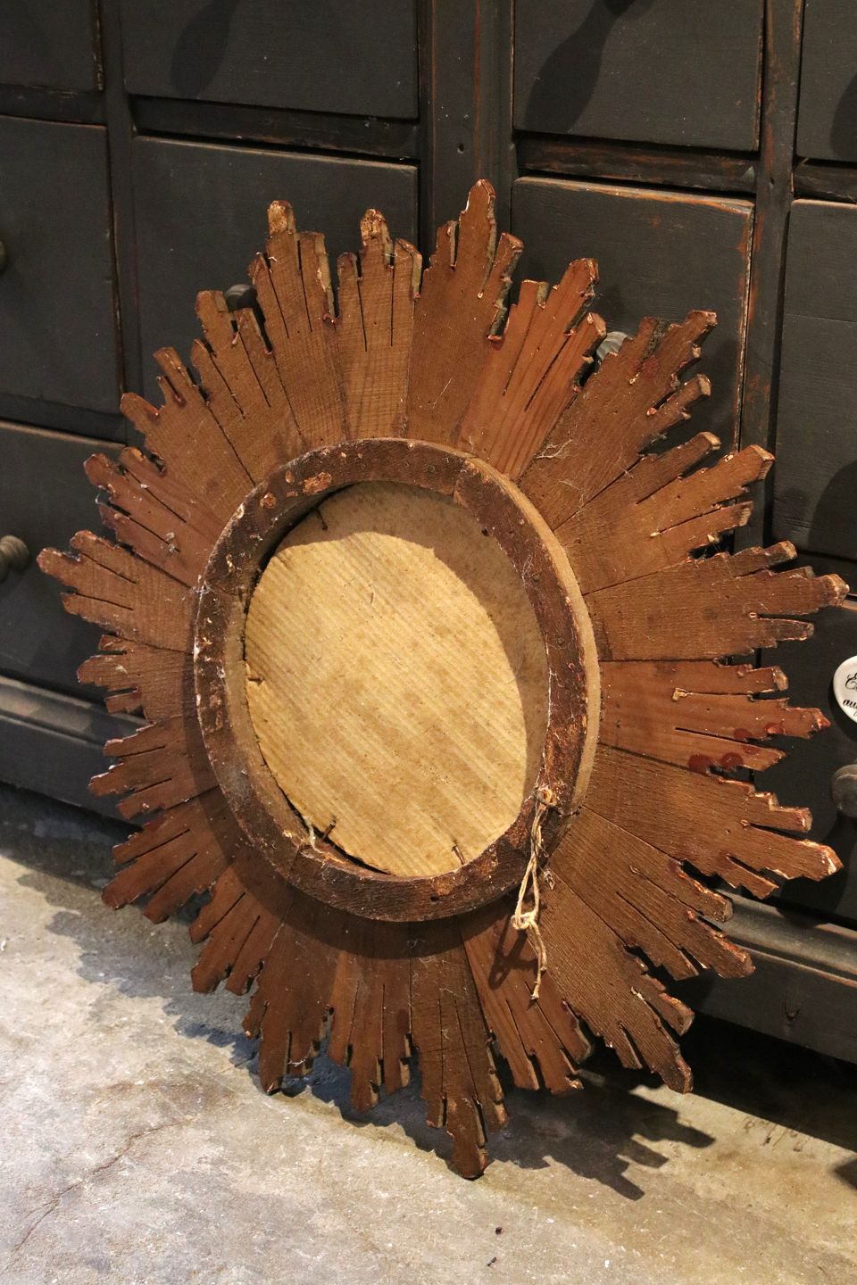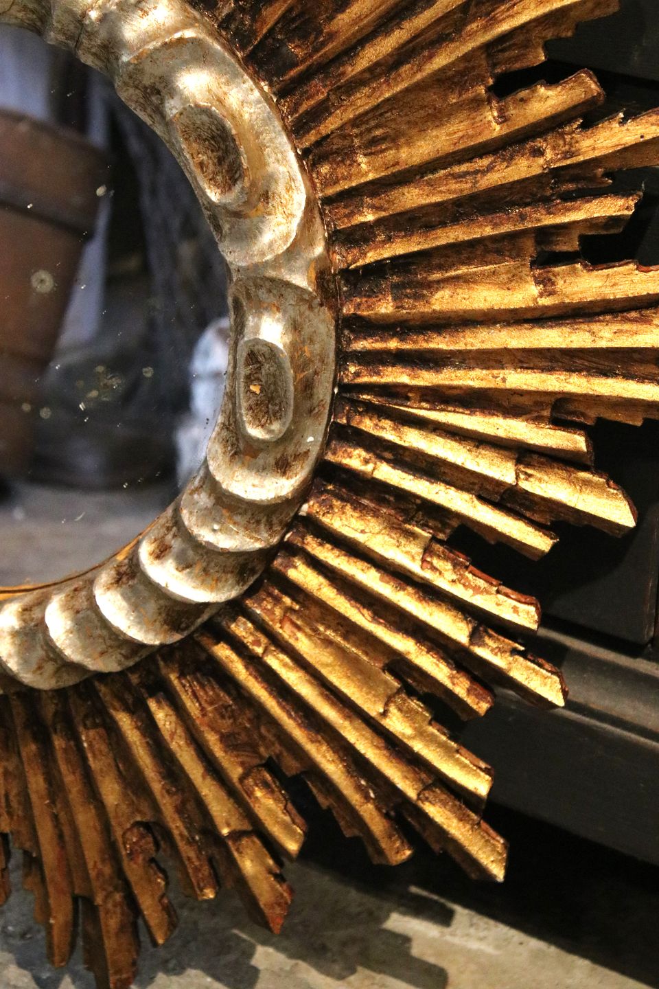 Fint , gammelt sol spejl i forgyldt / forsølvet træ med originalt gammelt spejlglas og en rigtig fin patina. Dia.: 66cm. Spejl Dia.: 24cm.