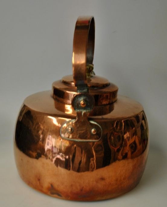 Dansk antik kobber kedel, 19. årh. Med hank og tud. Med messing knop. Ustemplet. H.: 18 cm. Dia.: Dia.: 20 cm. Højde ved hank: 26 cm.