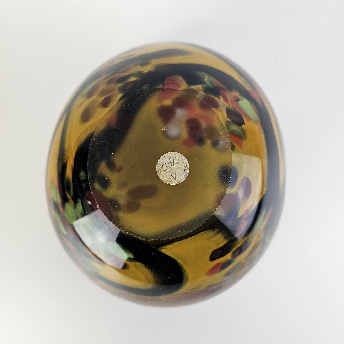 Unika skål i glas med abstrakt mønster i røde, sorte, gule og grønne nuancer