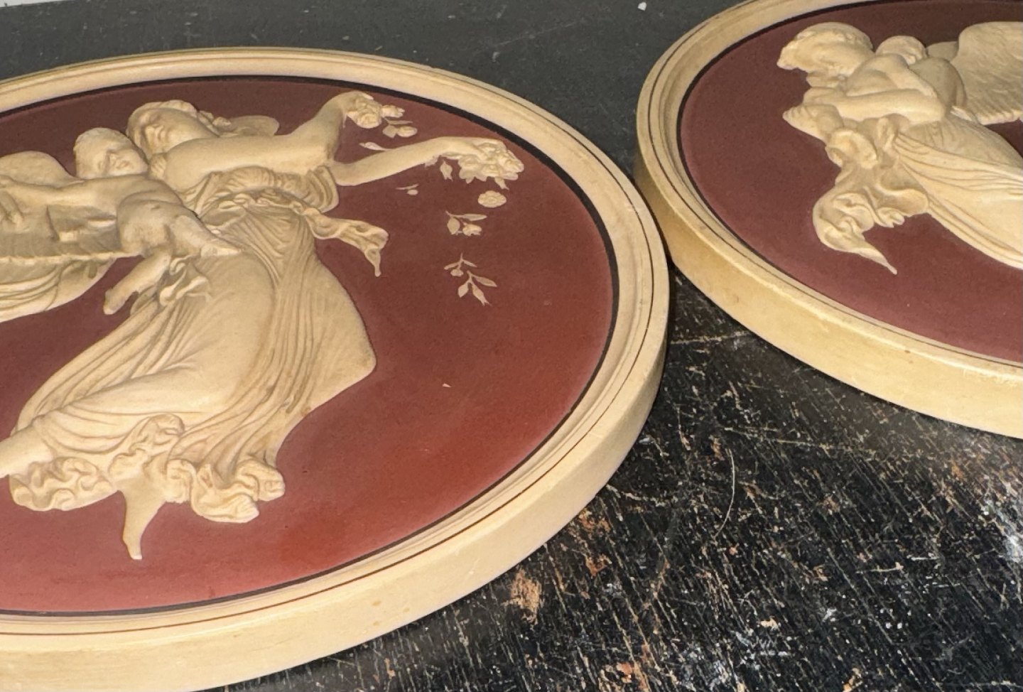 Par platter med motiv af Bertel Thorvaldsens “Natten & Dagen” i relief. Udført på Hans Christian Brix (1831-1907) værksted i gips i slutningen af 19. Århundrede. For at fremhæve relieffet er bunden malet Bordeaux. Platten fremstår i god stand med få brugsspor på bagsiden, hvor producentens navn er påstemplet - H. C. Brix. Diameter 18,3 cm