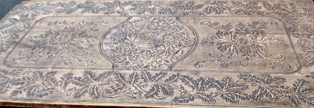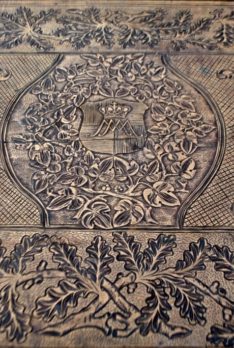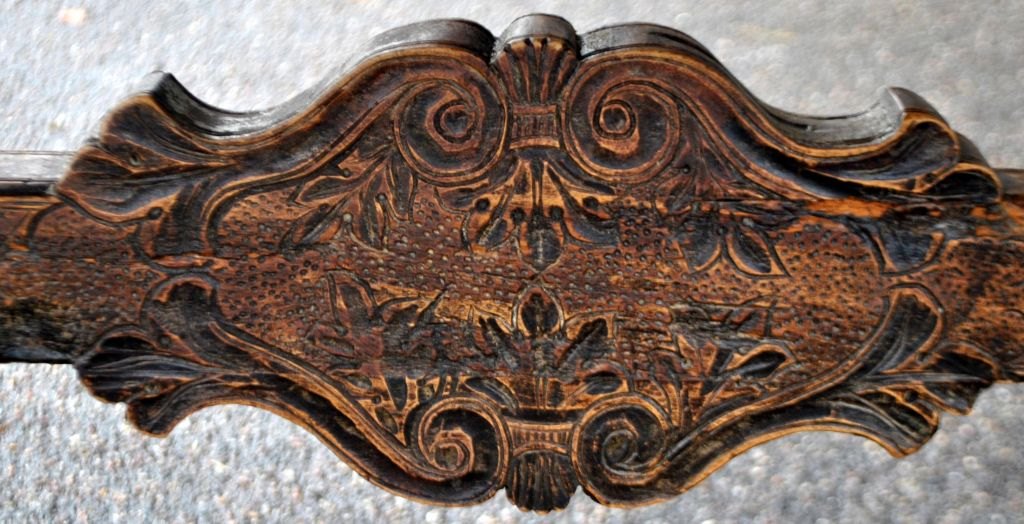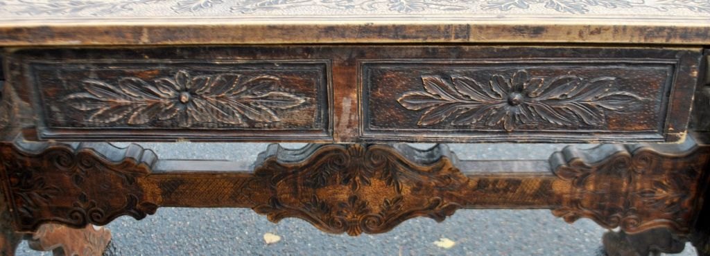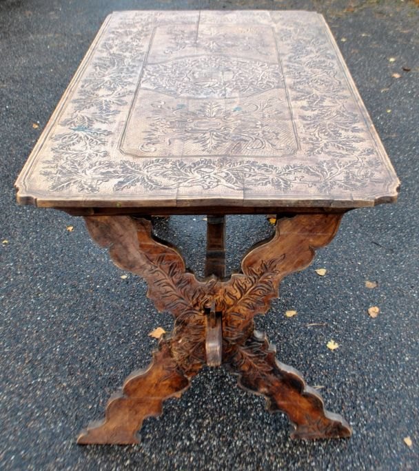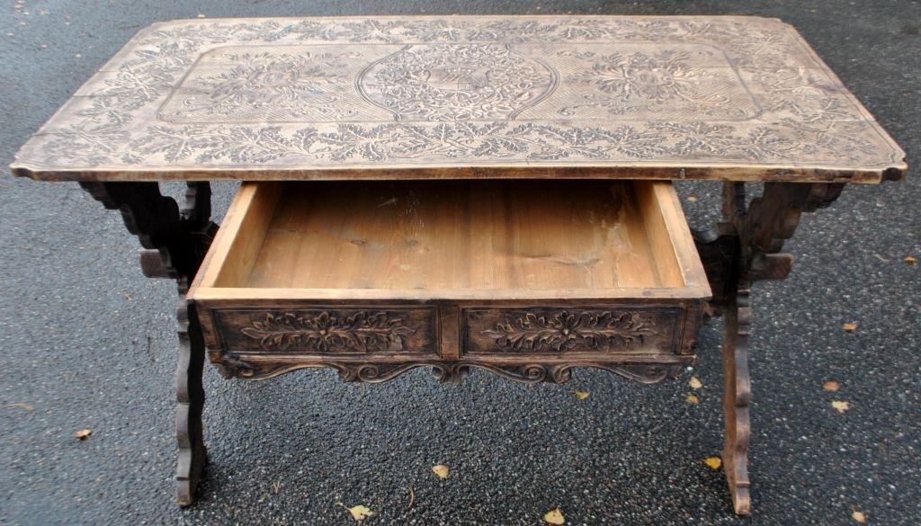 Antikt langbord med skæringer og skuffe, 19. årh. Utallige skæringer på plade, skuffe, ben og understel. I midten udskæring af hertug krone. Antagelig Tyskland. L.: 141 cm. B.: 73 cm. D.: 77 cm.