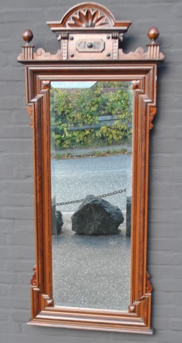 Stort dansk entre spejl, 1870-1880. Valnød og mahogni. Top med dekorationer og kugler. Facetslebet spejl. H.: 159 cm. B: 67 cm.