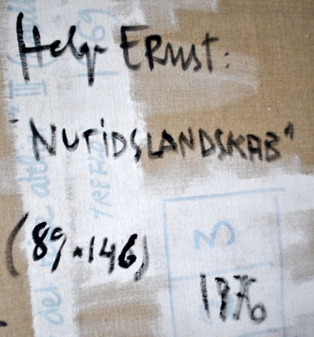 Ernst, Helge (1916 - 1991) Danmark: Nutidslandskab. Olie/collage på lærred. Signeret. 89 x 140 cm.