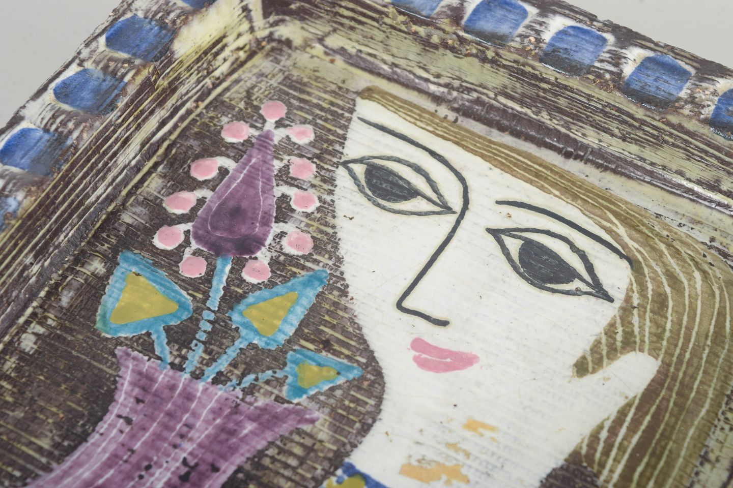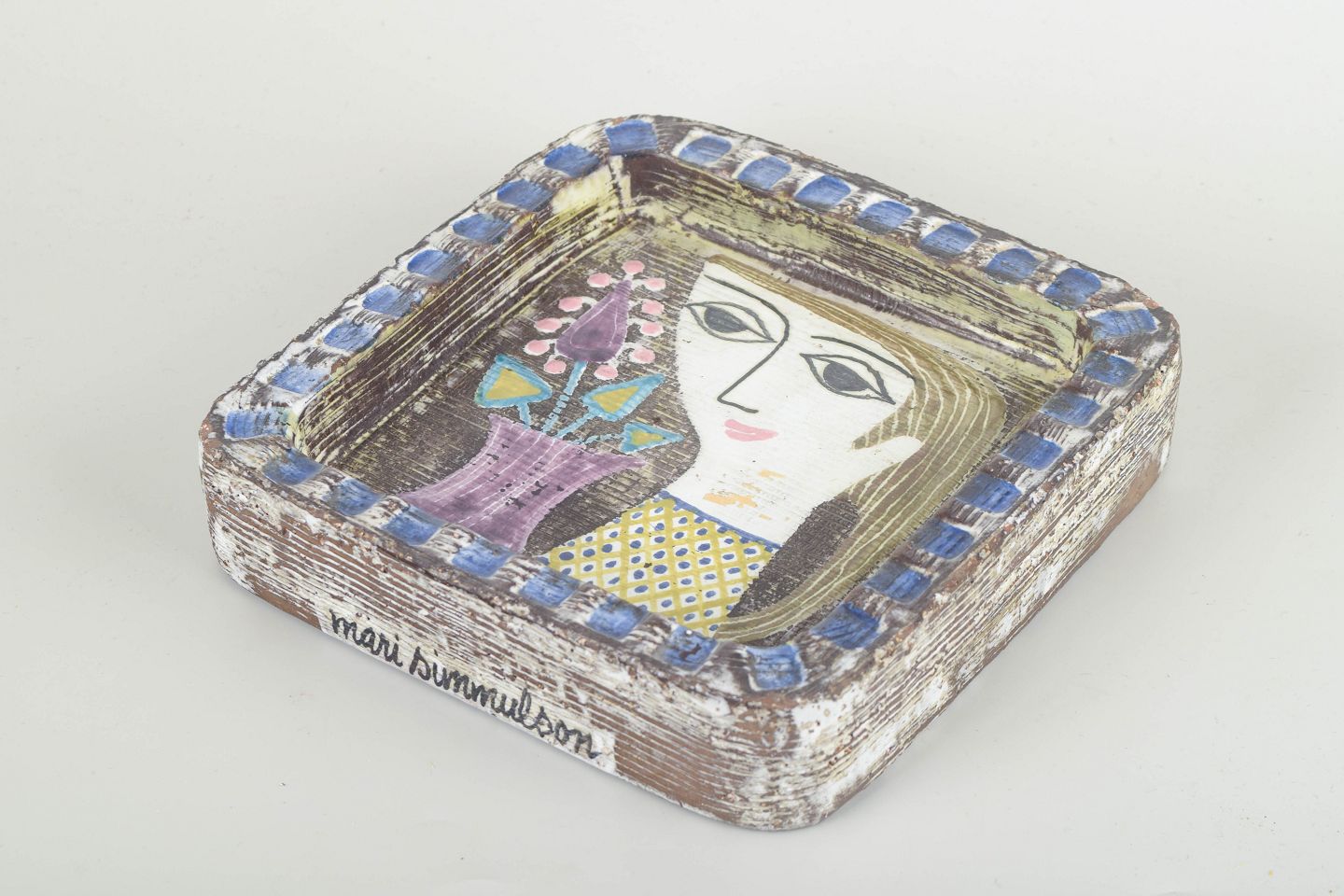 Rektangulært relief-fad i chamotte-stentøj med håndmalet motiv af kvinde og vase i lilla, blå og gule toner. Designet med Simmulsons karakteristiske kombination af modernistisk stil og varm, humanistisk udtryksform.