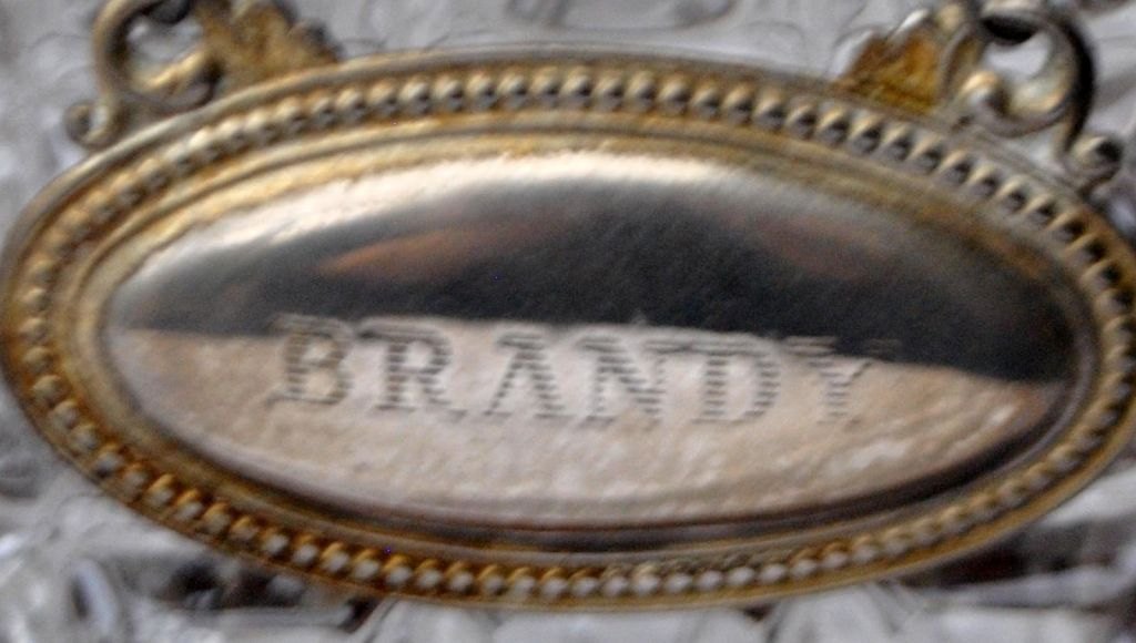 Engelsk tantalus med tre krystal karafler, 19. årh. Poleret egetræ. Med messingbeslag og lås med nøgle. Karafler forsynede med forsølvede skilte for brandy, sherry og whisky. H: 31 cm. L: 35 cm.