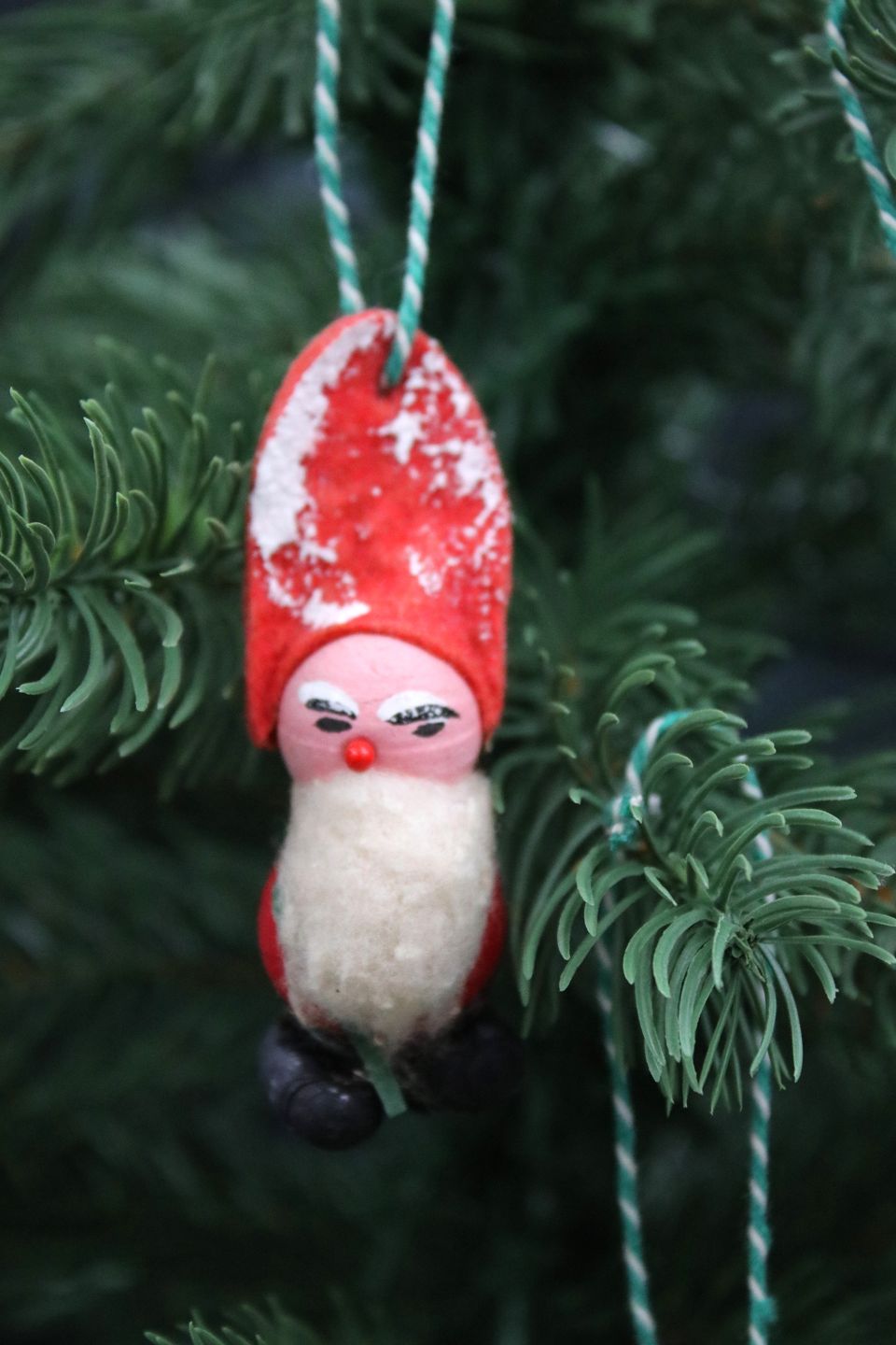 Gammel julemand lavet i vat og filt til at hænge på juletræet.