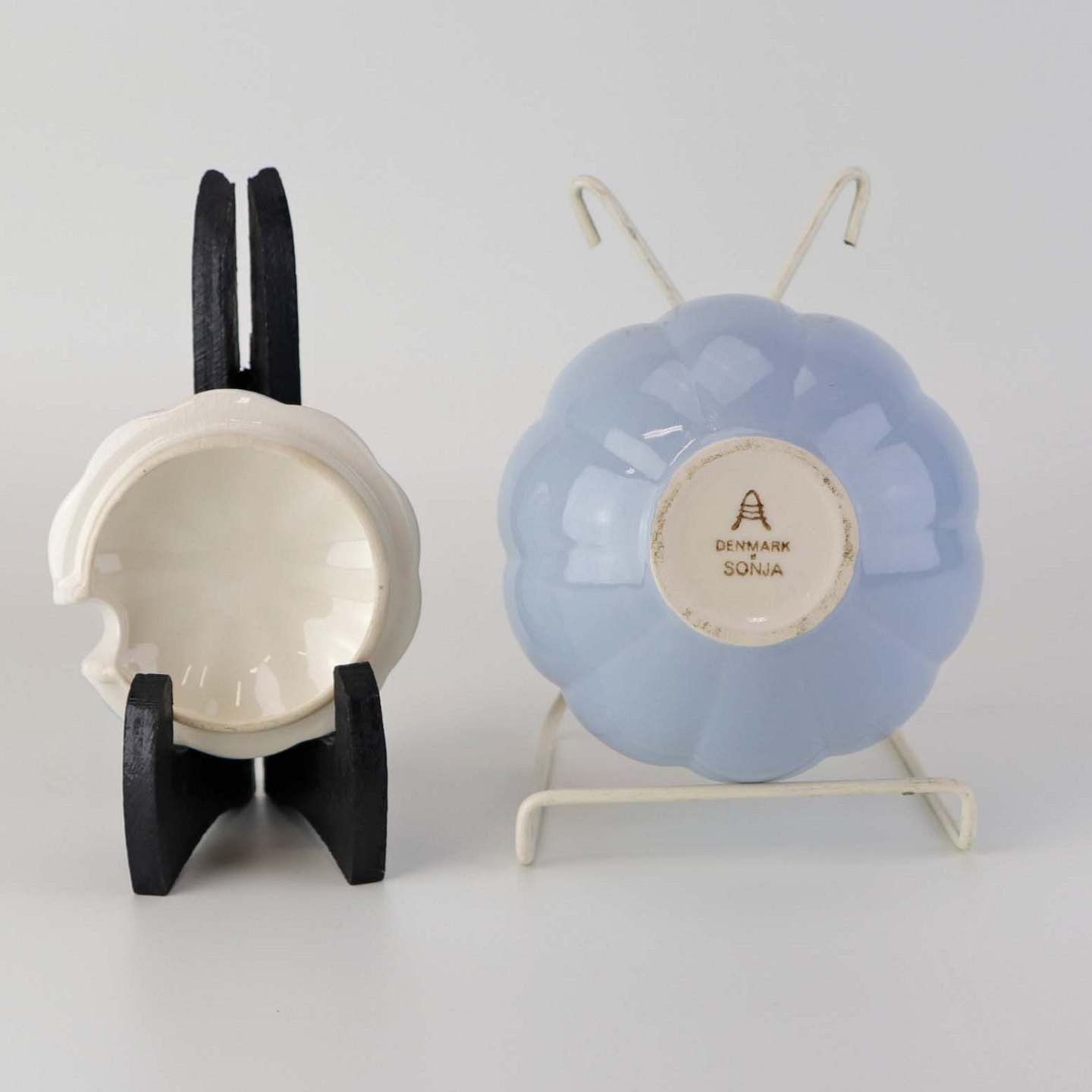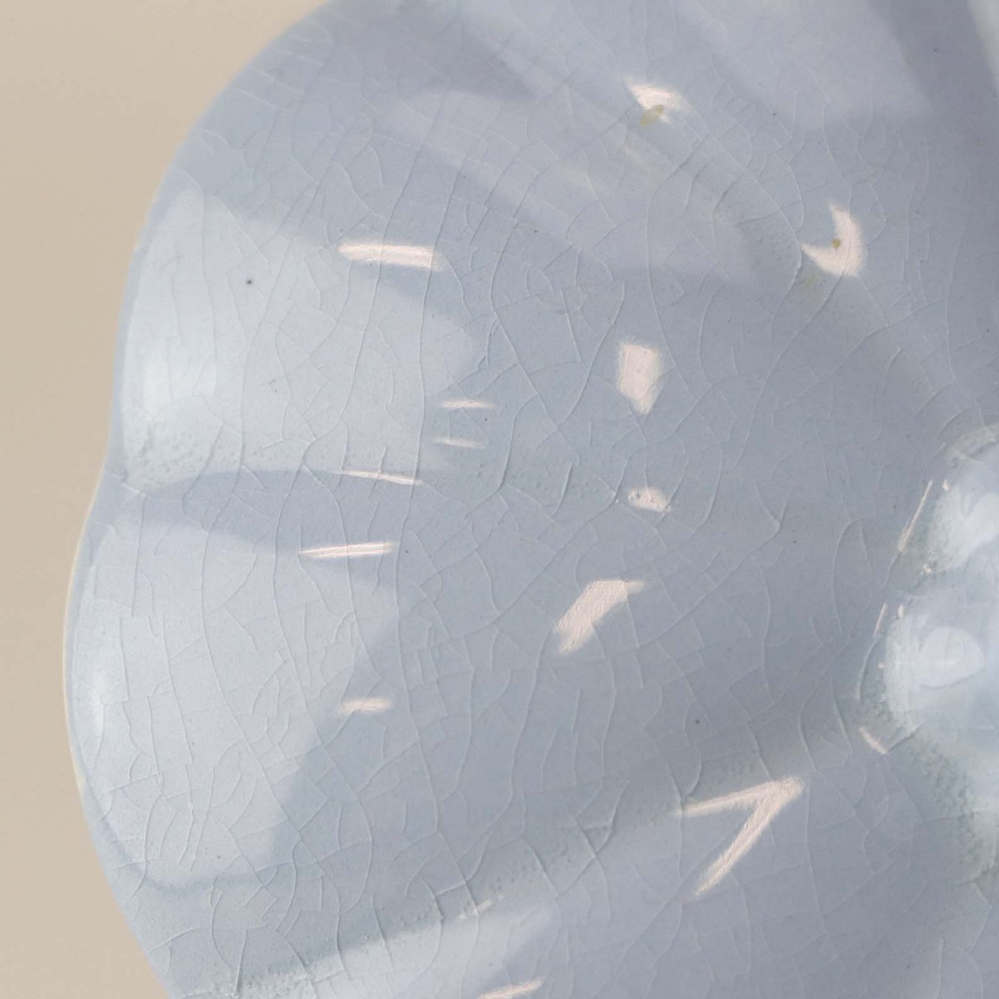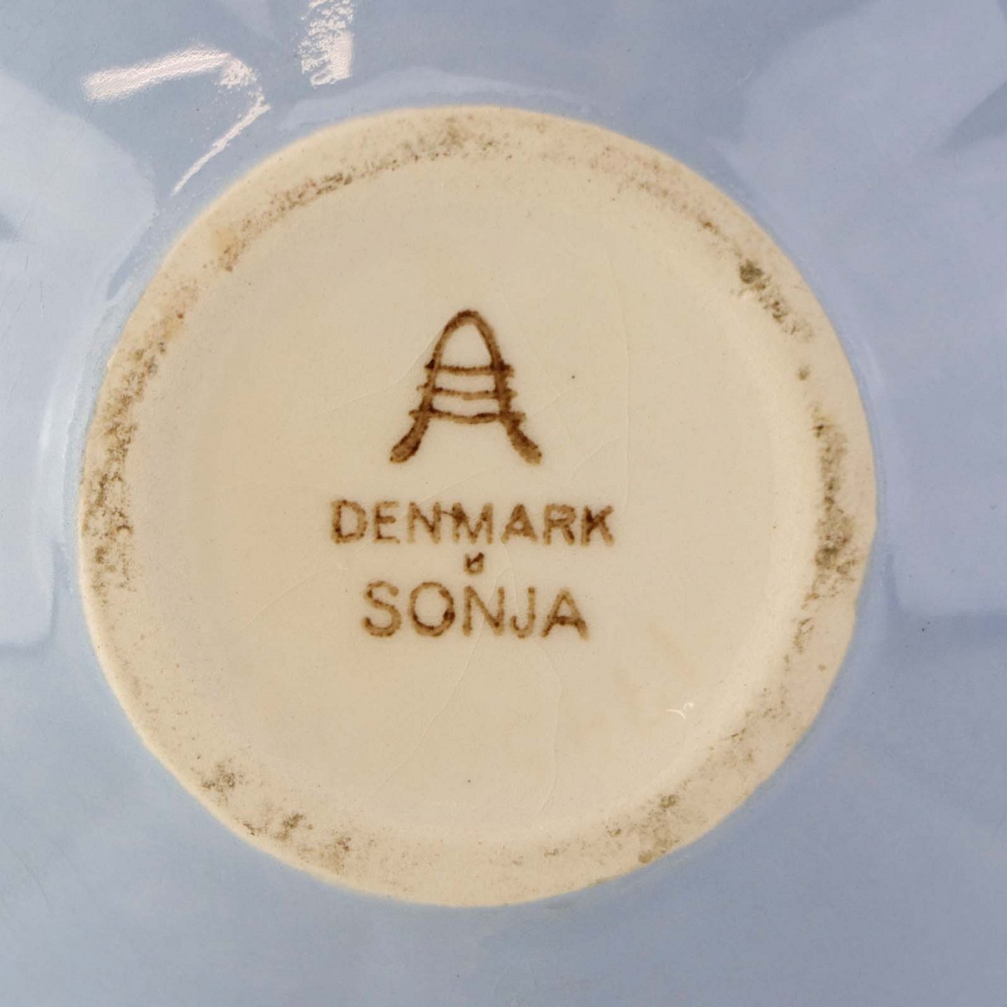 Service i lyseblå fajance dekoreret med tynd hvid kant.