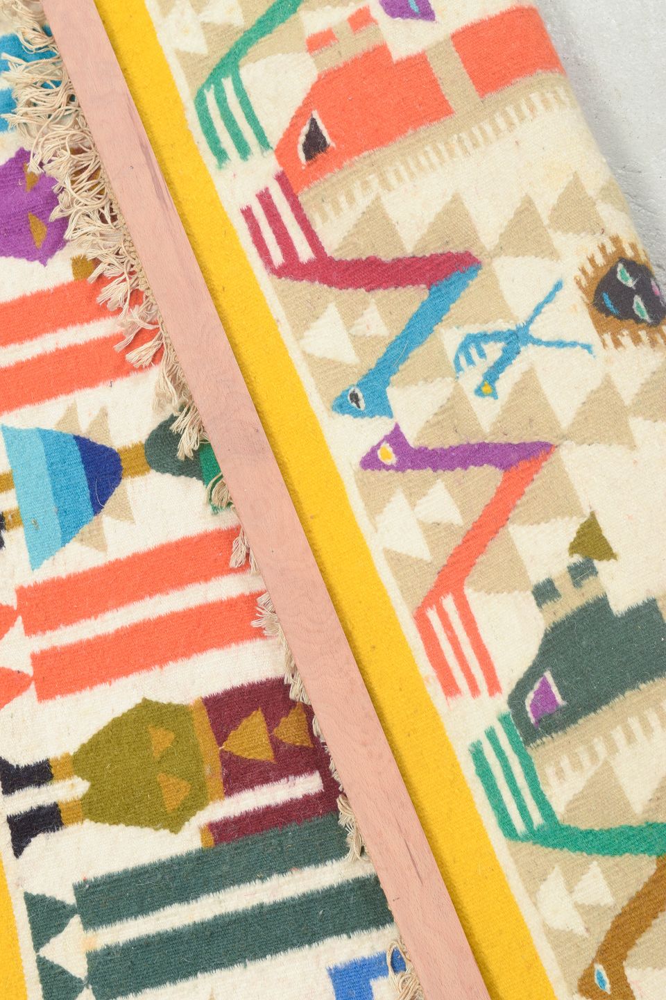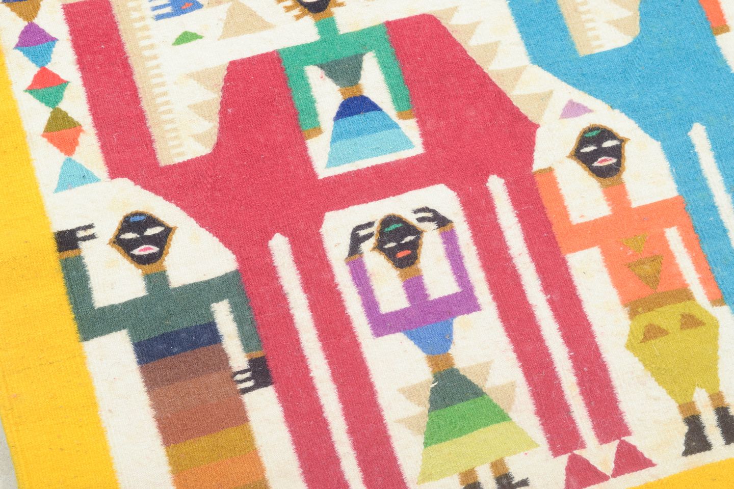 Håndvævet rölakan-vægtæppe i uld med et farverigt, figurativt motiv i stærke toner af gul, blå, rød, grøn og lilla på sennepsgul bund. Et karakteristisk eksempel på 1970’ernes svenske vævekunst, hvor traditionel rölakan-teknik blev brugt i dekorative og kunstneriske kompositioner.