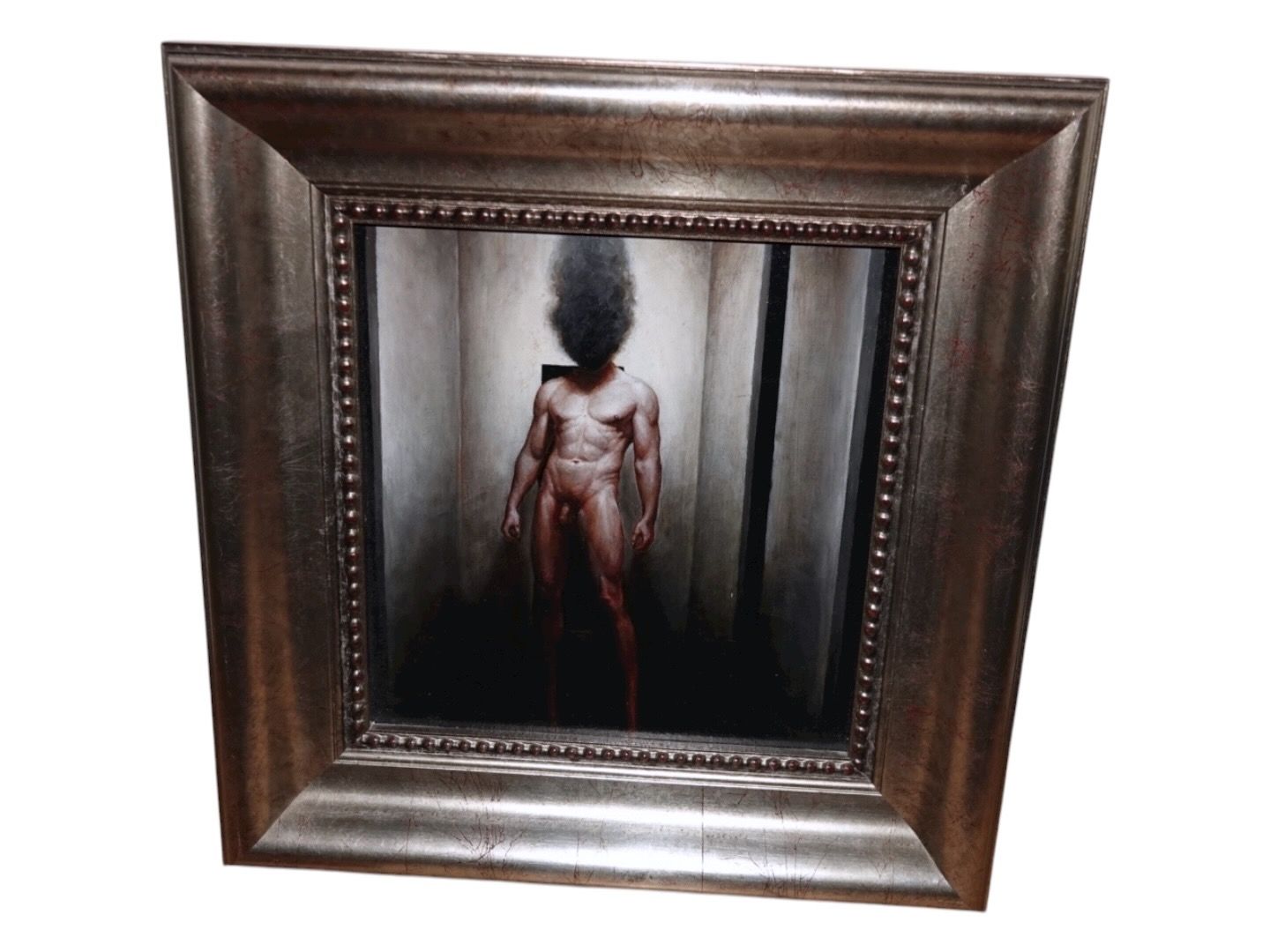 Akryl og oliemaleri af nøgen mand i bred sølvramme fra 2010.