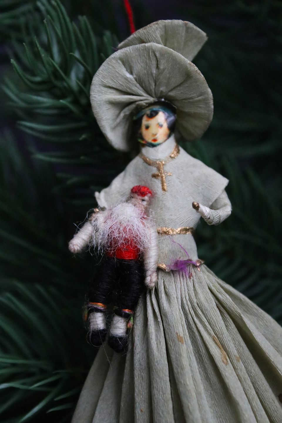 Gammelt juletræspynt , fin dame der holder en lille julemands dukke ,