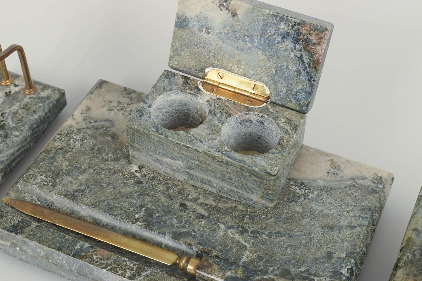 Elegant skrivebordssæt i grågrøn marmor bestående af brevholder, brevkniv, blækholder og blæksuger. Udført med messingdetaljer og karakteristisk skandinavisk modernistisk formsprog. Et funktionelt og dekorativt sæt, der vidner om tidens sans for ædle materialer og håndværksmæssig kvalitet.