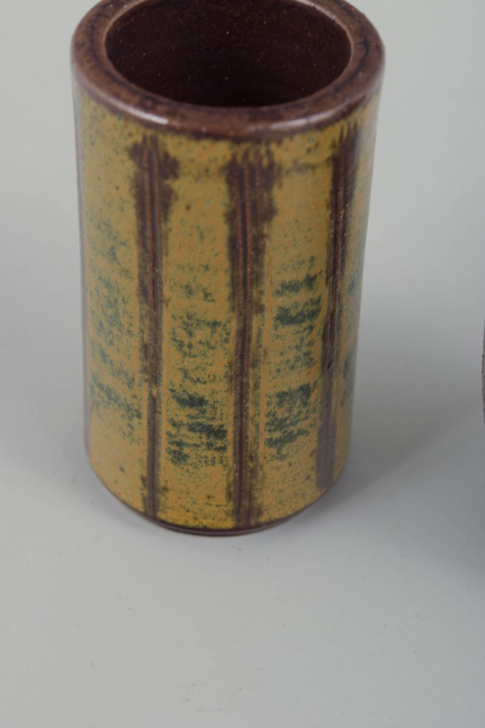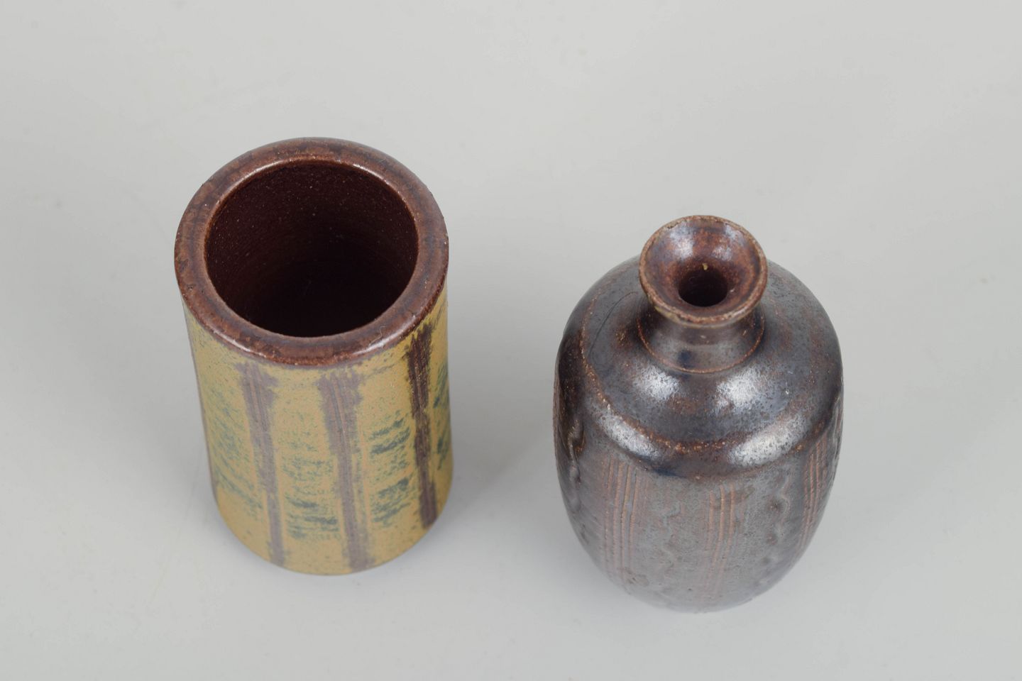 To hånddrejede miniaturevaser i stentøj med eksperimenterende glasurer i brune, grønne og gyldne toner. Et elegant eksempel på svensk studiokeramik med raffinerede proportioner og levende glasurspil.