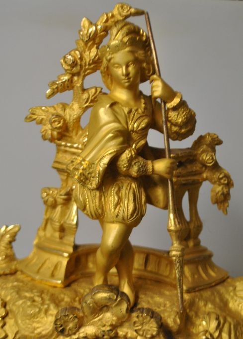 Fransk lueforgyldt kaminur, 1800-tallets begyndelse. Urkasse med dekorationer. Topfigur i form af stående soldat med spyd. Emaljeurskive med romertal. H.: 35 cm. B.: 25 cm. D: 7 cm.