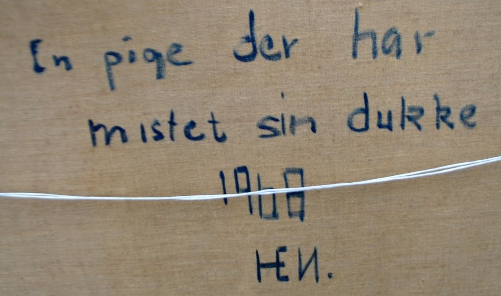 Dansk kunstner (20. årh.): En pige, der har mistet sin dukke. Olie på lærred. Verso tekst og monogram 1968. 66 x 100 cm.  Indrammet: 85 x 120 cm.  Givet som gave til kunsthandler Hans Erik Nielsen, Aarhus. Antagelig et værk af Kaj Christensen.