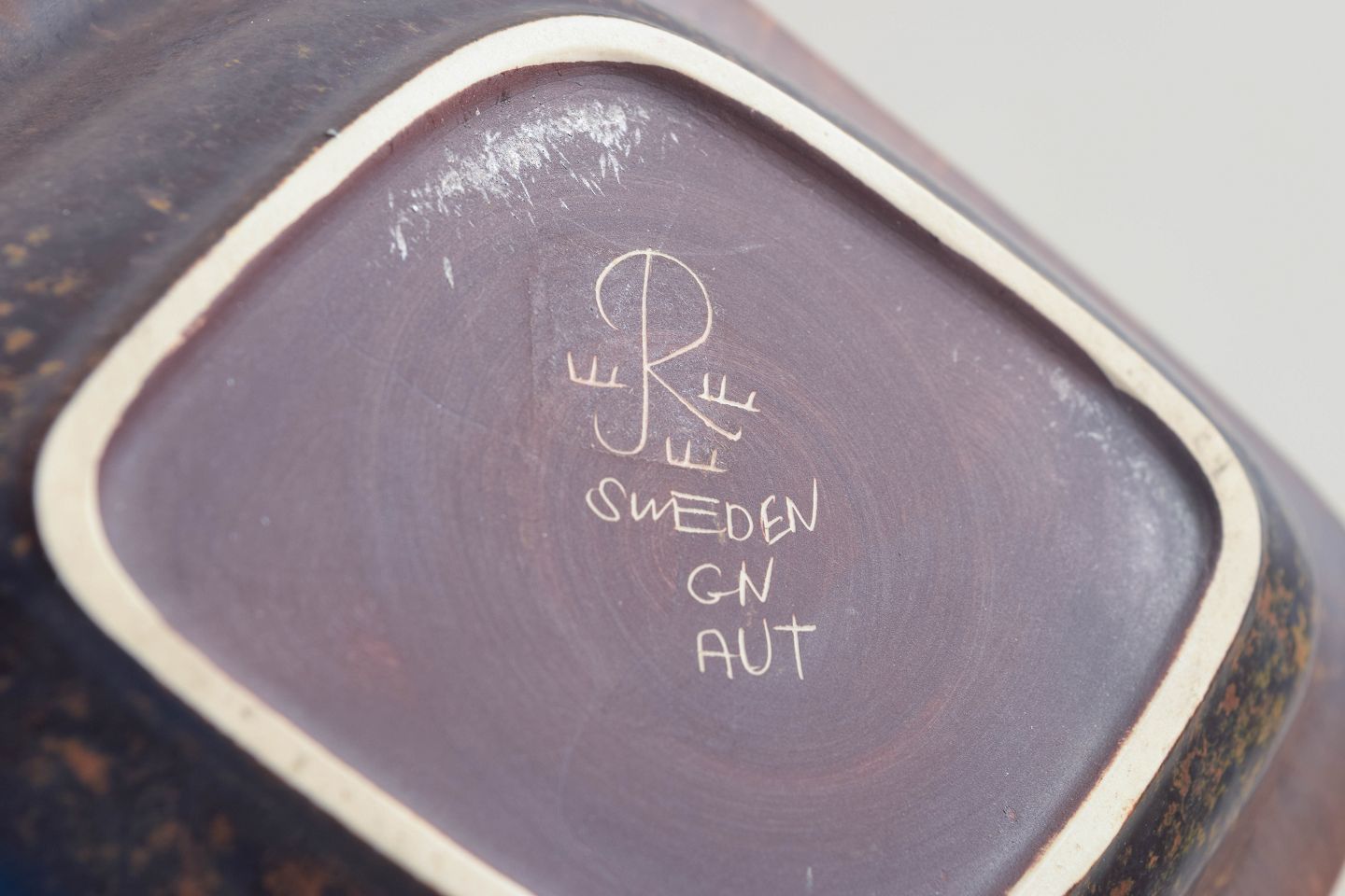 Lav, firkantet skål i stentøj med let buede sider og glasur i brunrøde nuancer med levende spil og løbende effekt. En karakteristisk form og glasur fra Nylunds mid-century produktion for Rörstrand, hvor funktion og æstetik forenes i et skulpturelt udtryk.