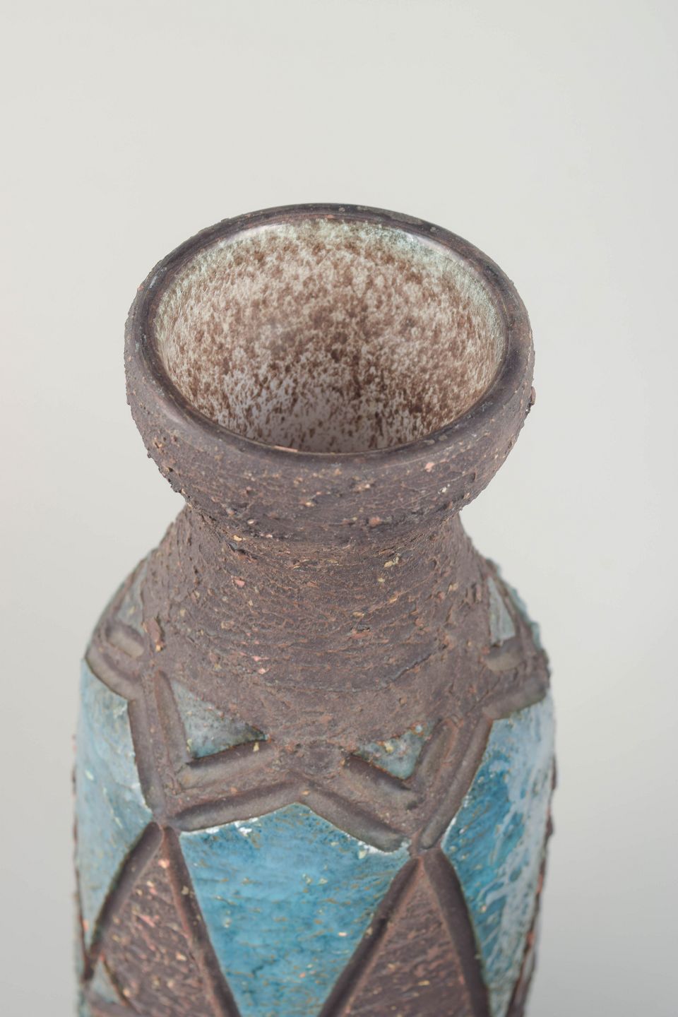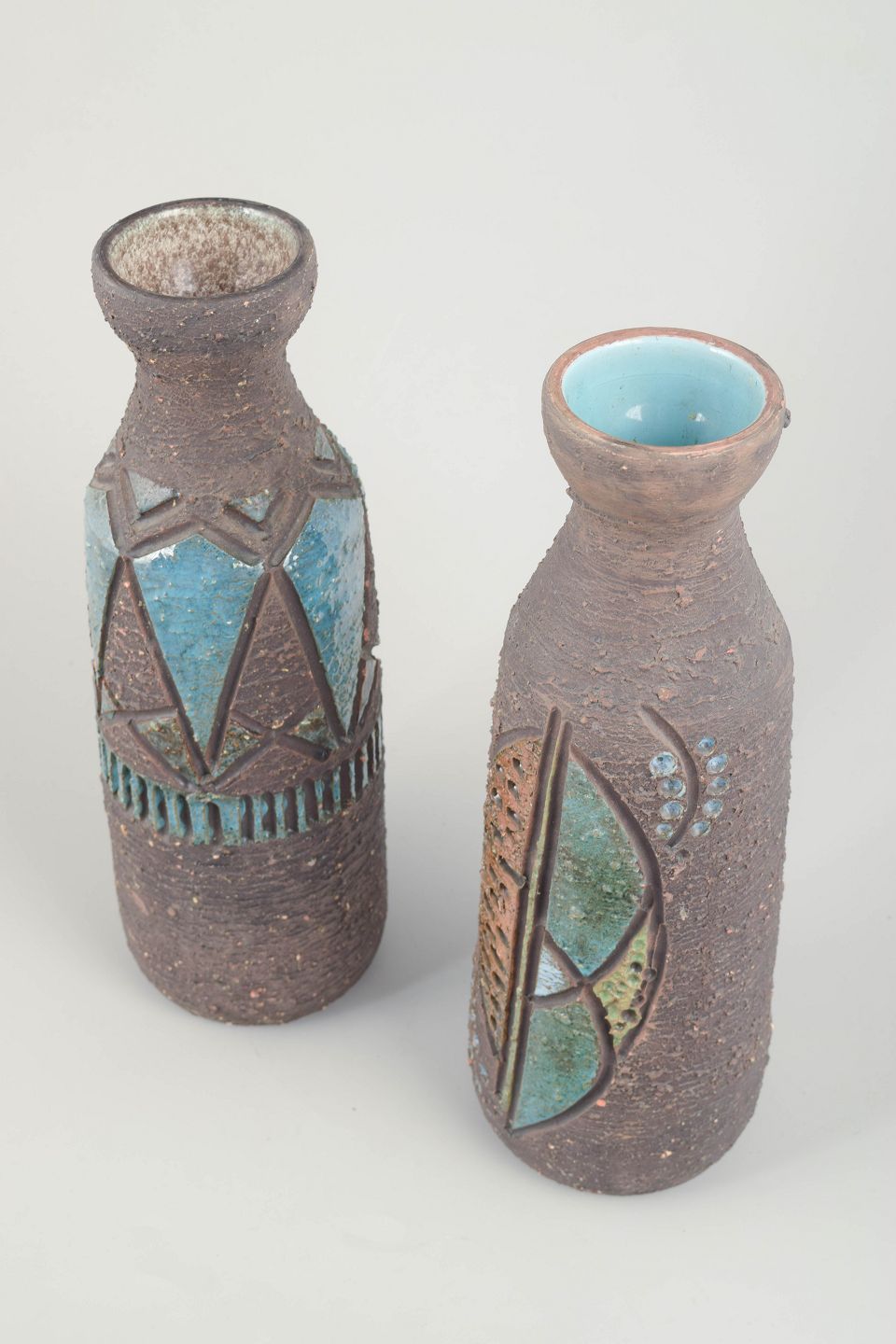 To håndlavede flaskelignende vaser i chamotte-ler med reliefdekoration og indlagte felter af farvet glasur i turkis, grønne og brunlige nuancer. Typisk for Tilgmans’ rustikke stil med stærk tekstur og geometrisk ornamentik.