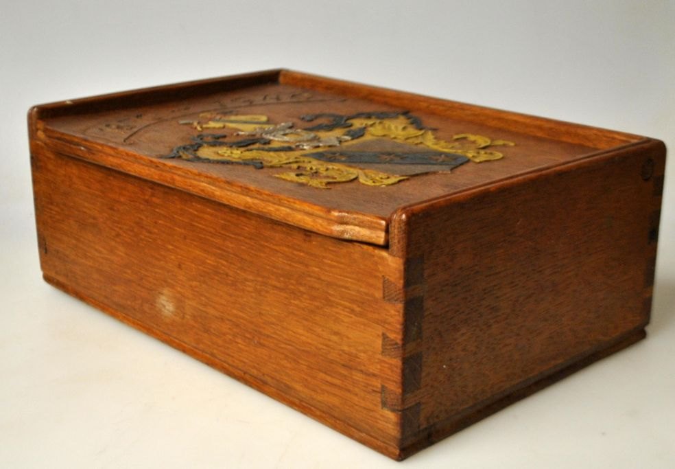 Et dansk egetræs skrin med skæring på låg i form af adelsmærke, 1940.