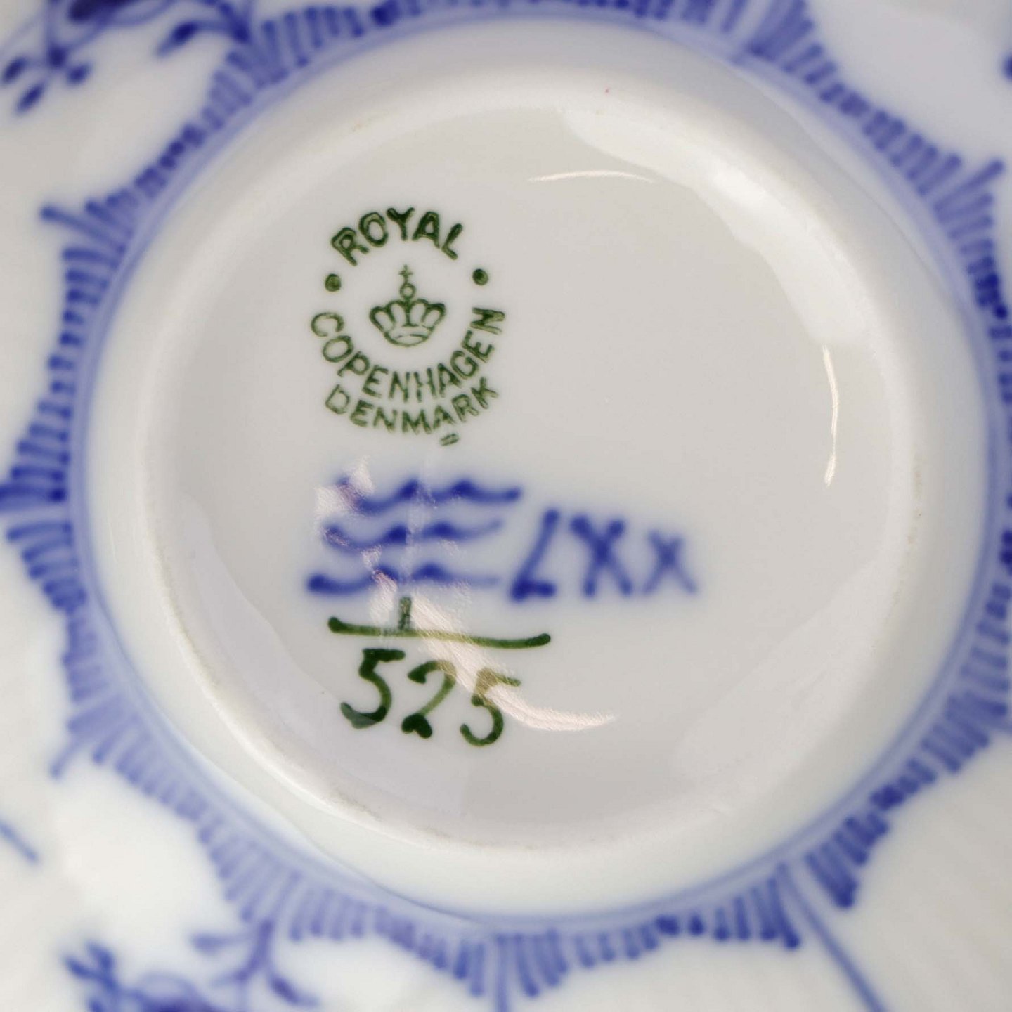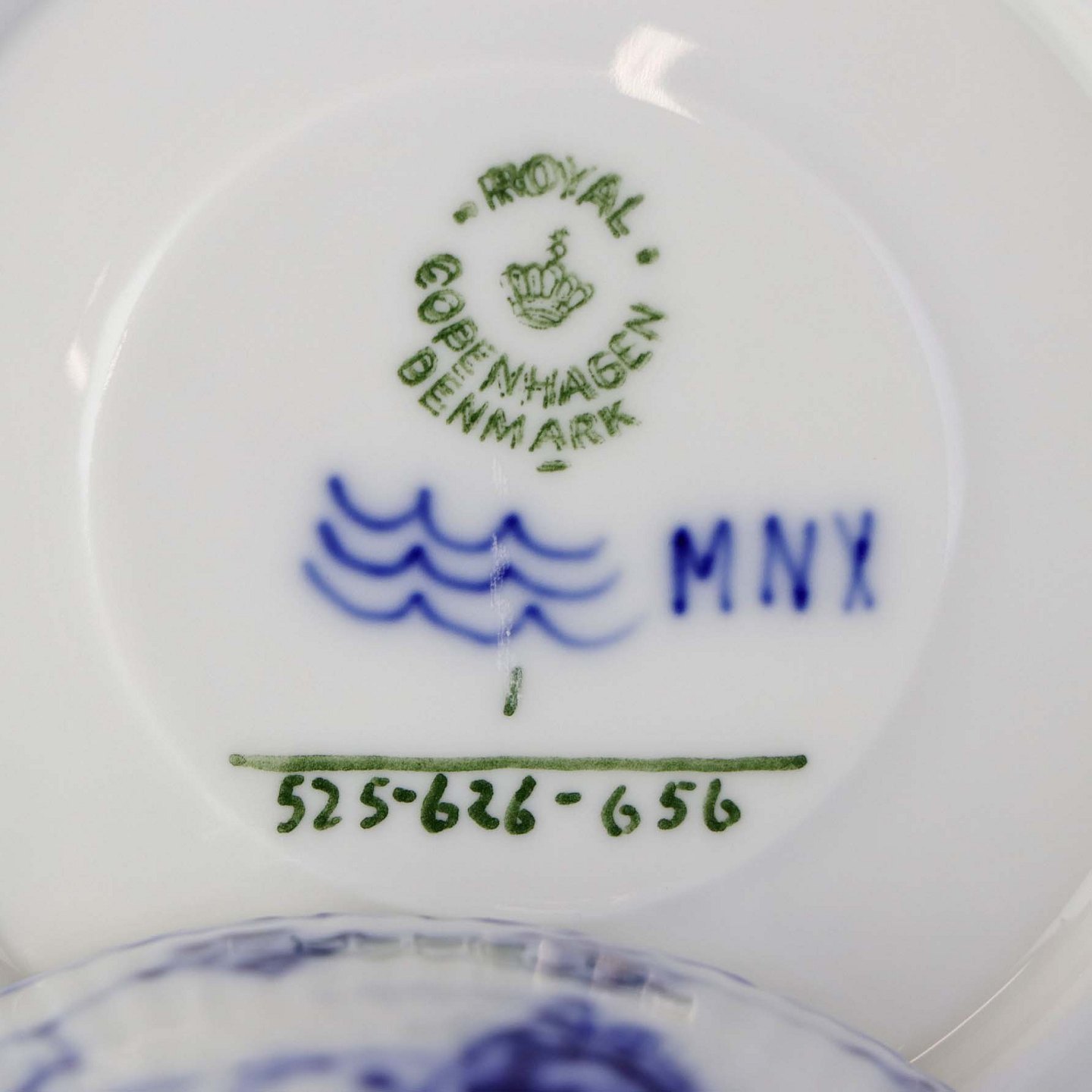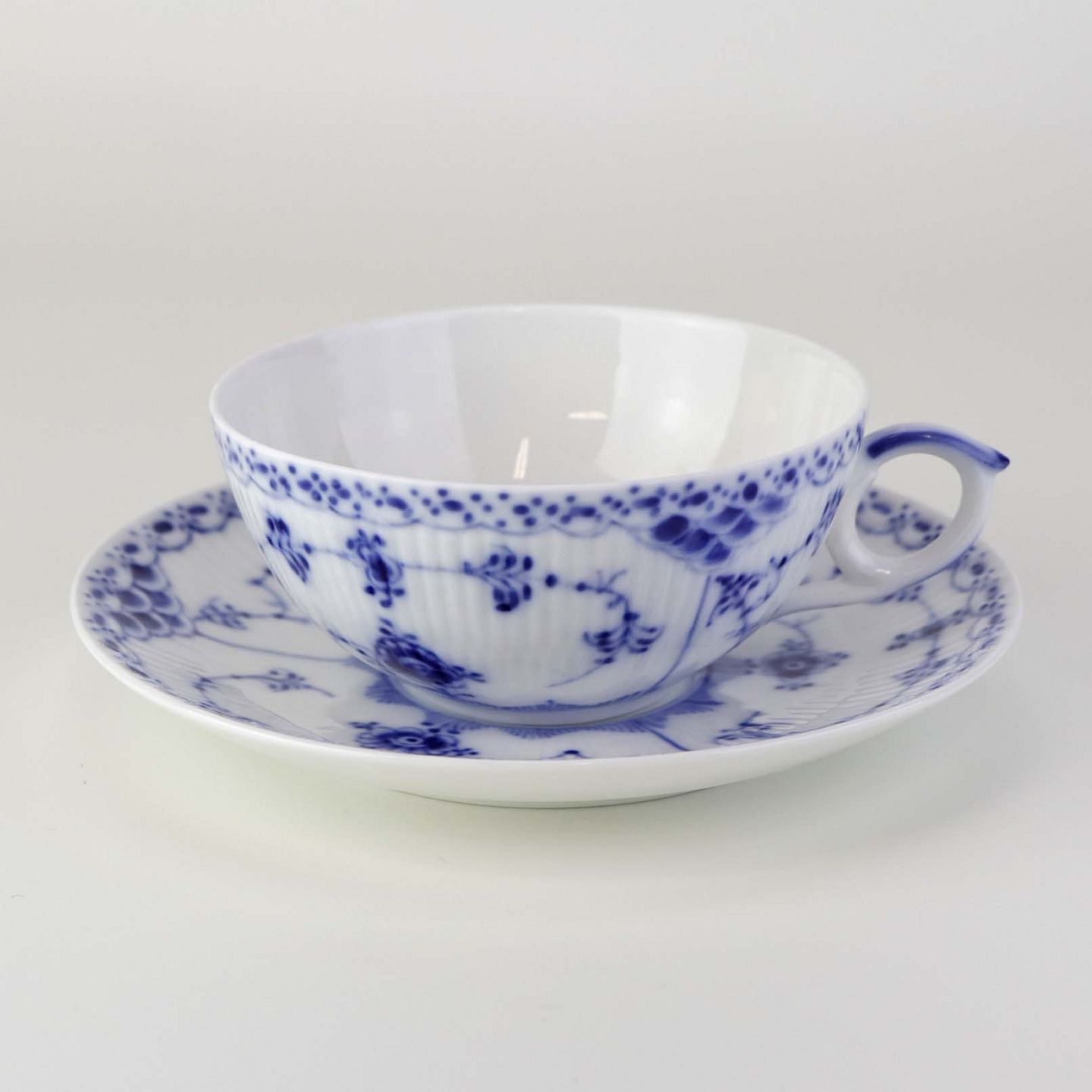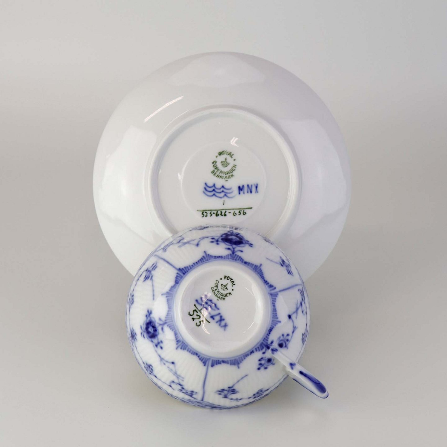 Mellemstørrelsse tekop med underkop i kongeligt porcelæn fra stellet Musselmalet Halvblonde. Nr. 1/525 og 1/525-626-656