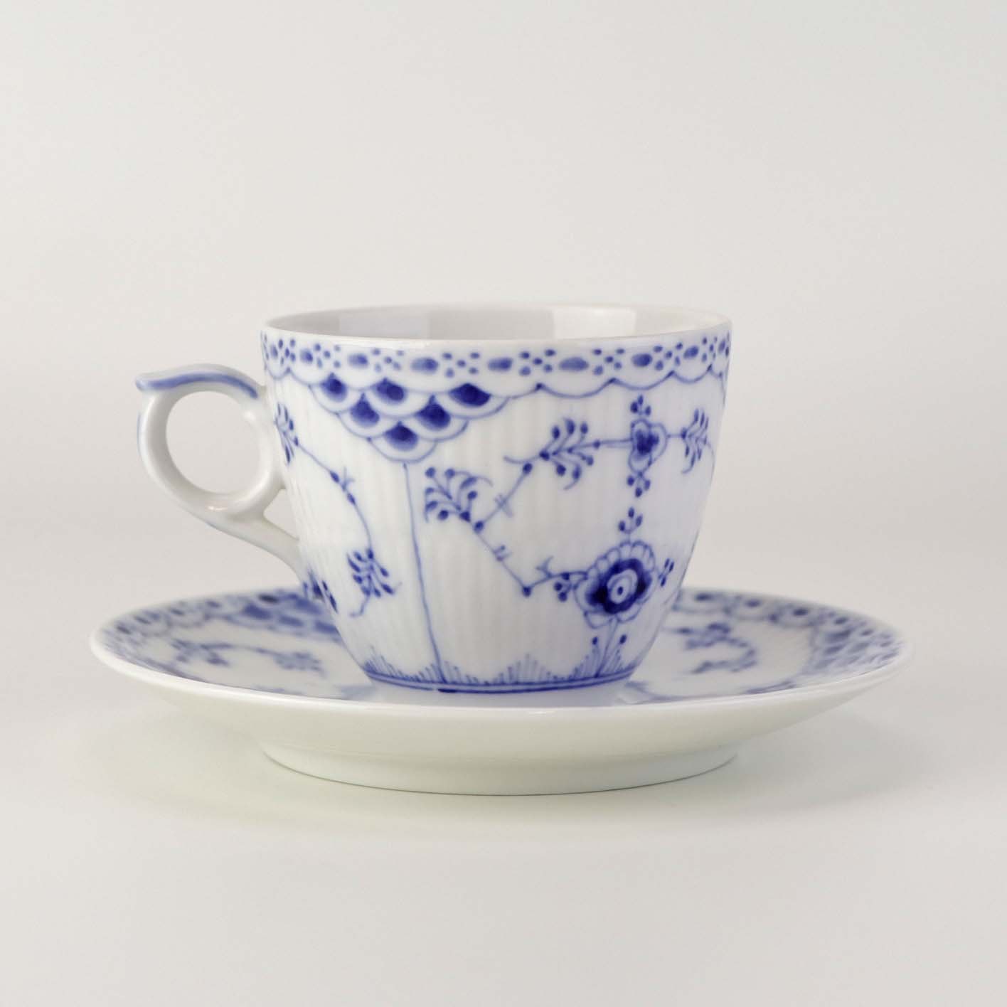 Mokkakop med underkop i kongeligt porcelæn fra stellet Musselmalet Halvblonde. Nr. 1/528