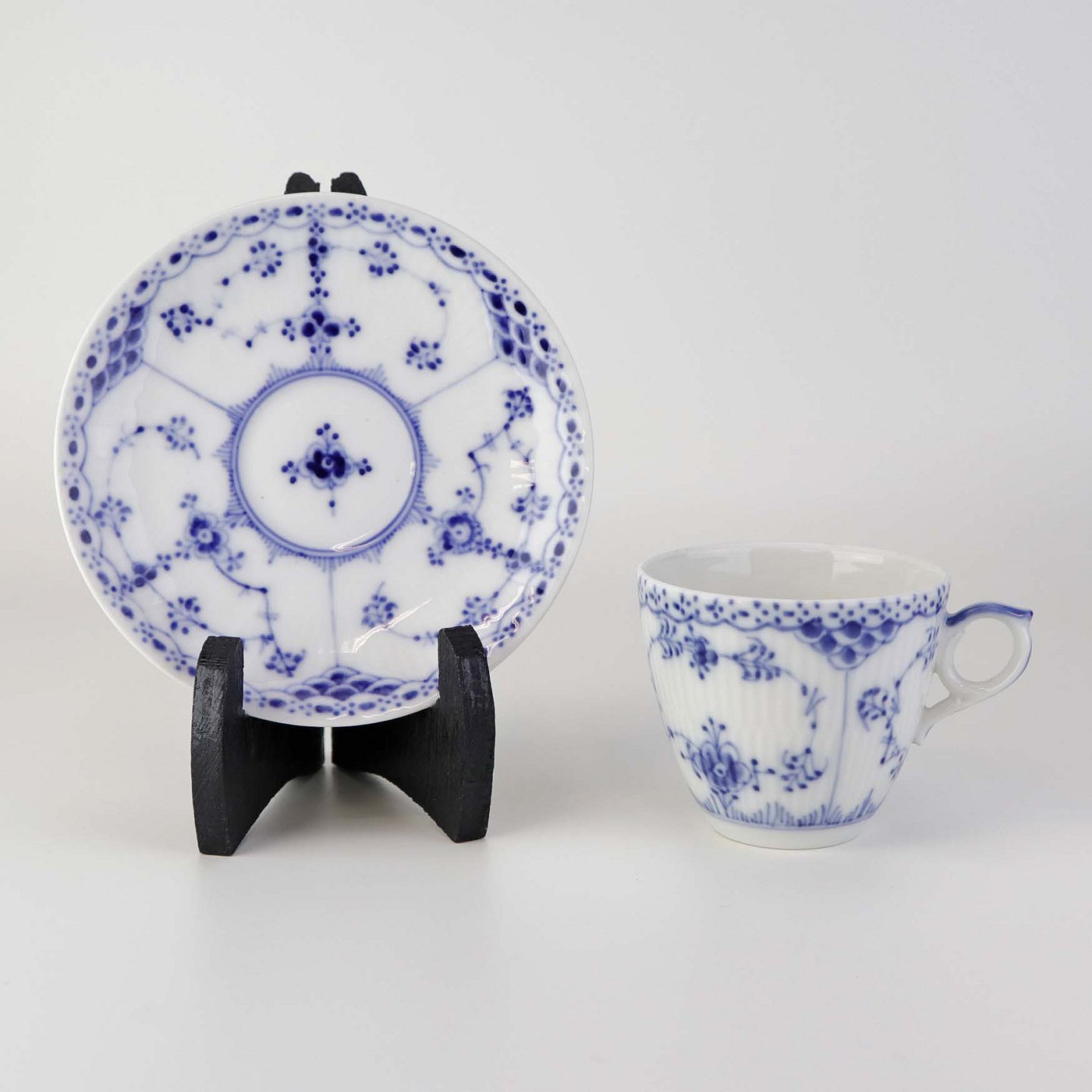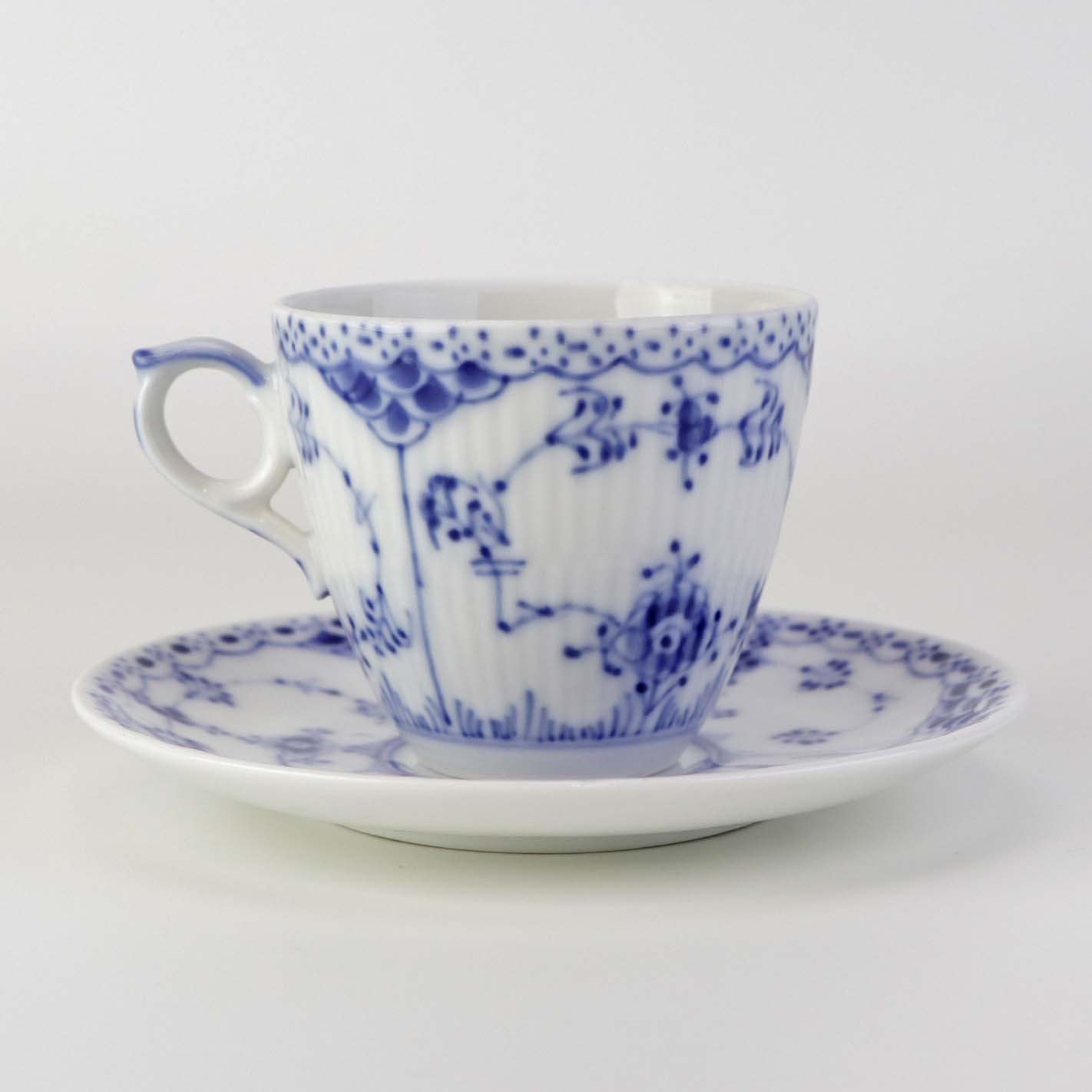 Mellemstor kaffekop med underkop i kongeligt porcelæn fra stellet Musselmalet Halvblonde. Nr. 1/719