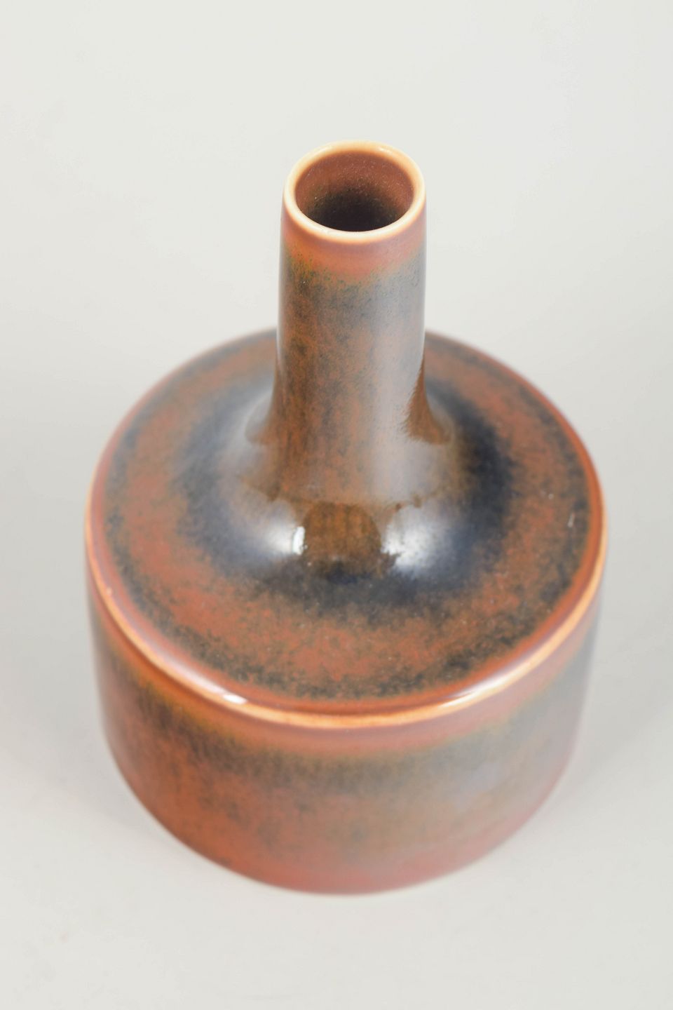 Elegant cylindrisk vase i glaseret stentøj med høj, slank hals og varme brun-røde og mørke nuancer i en karakteristisk Stålhane-glasur.