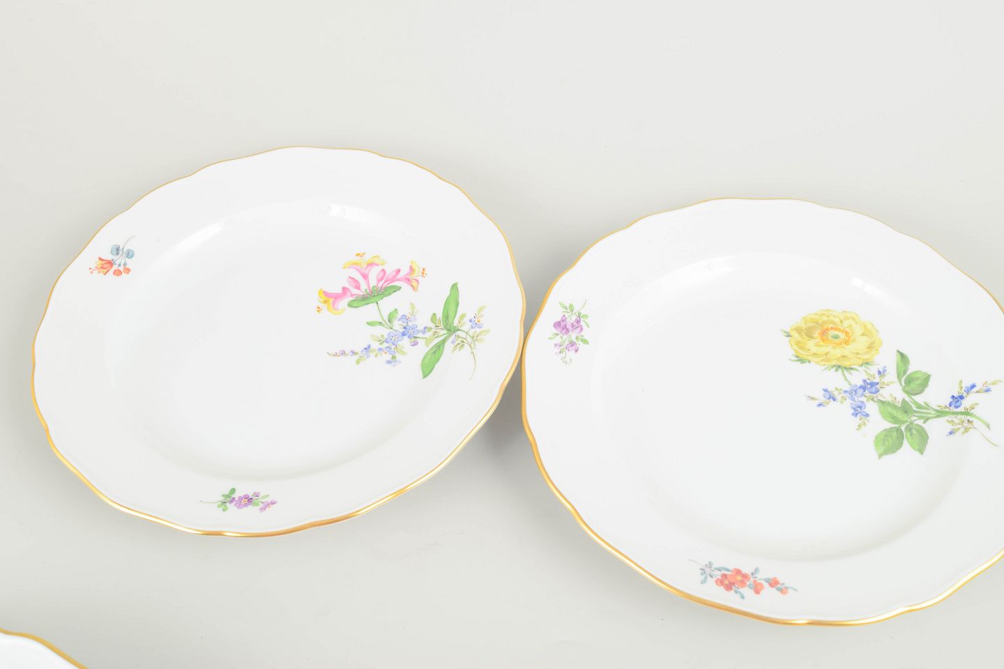 Meissen, grundlagt i 1710, var Europas første hårdporcelænsfabrik og satte standarden for håndmalet porcelæn gennem hele 1700- og 1800-tallet. Blomsterdekorationer – særligt de naturalistiske buketter – var blandt manufakturens mest efterspurgte motiver. Meissens arbejde fra slutningen af 1800-tallet er kendetegnet ved detaljerigdom, teknisk perfektion og en fortsat fastholdt tradition for forgyldte rande og klassiske former.