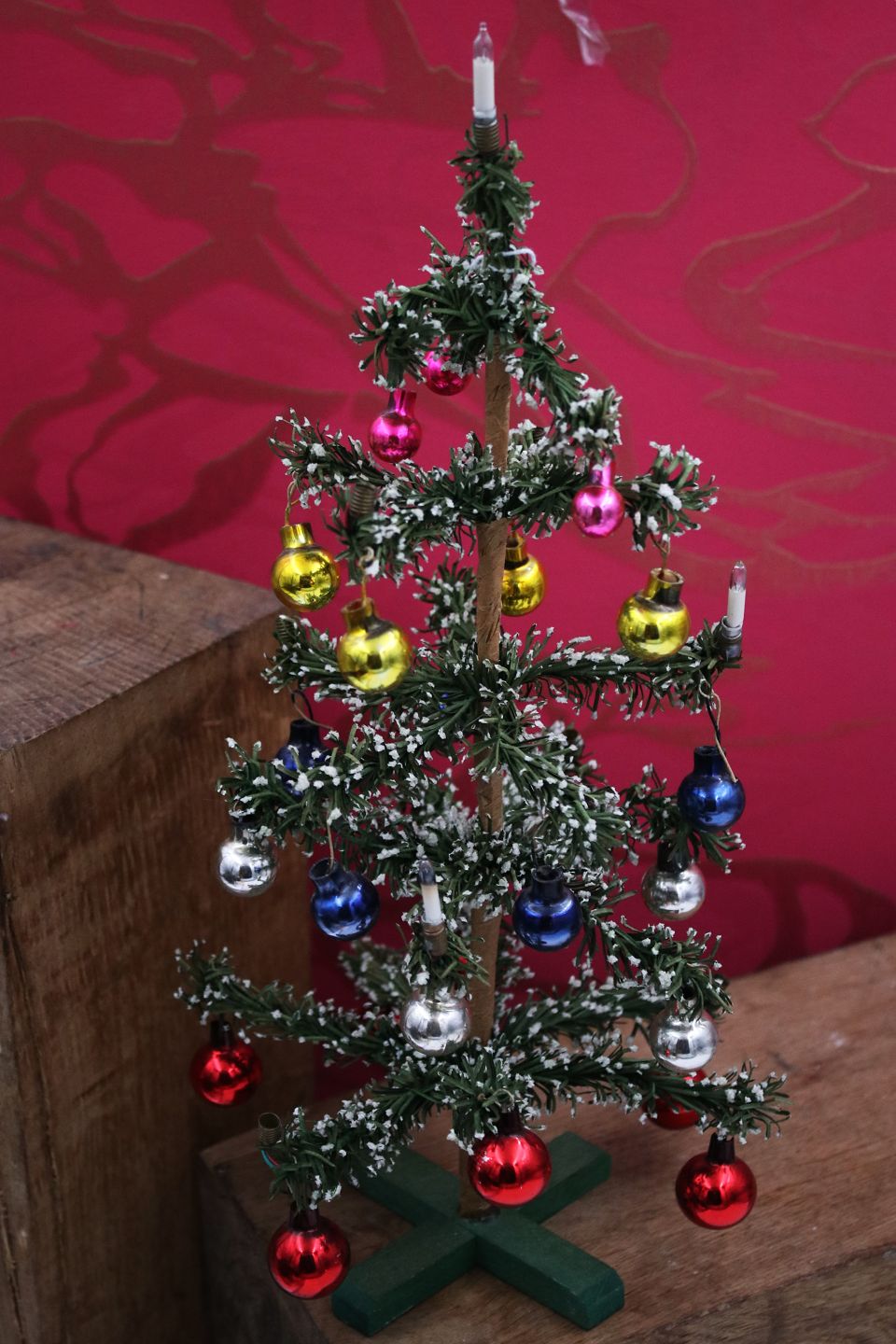 Antikt miniature juletræ , lavet i farvet papir og dekoreret med masser af små farvet jule glas kugler. Højde: 35cm.