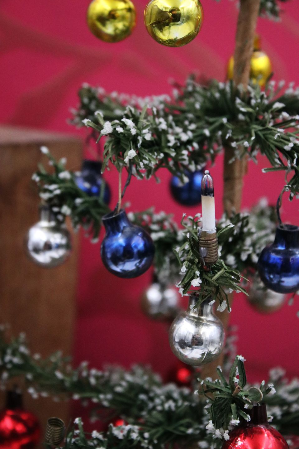 Antikt miniature juletræ , lavet i farvet papir og dekoreret med masser af små farvet jule glas kugler...
