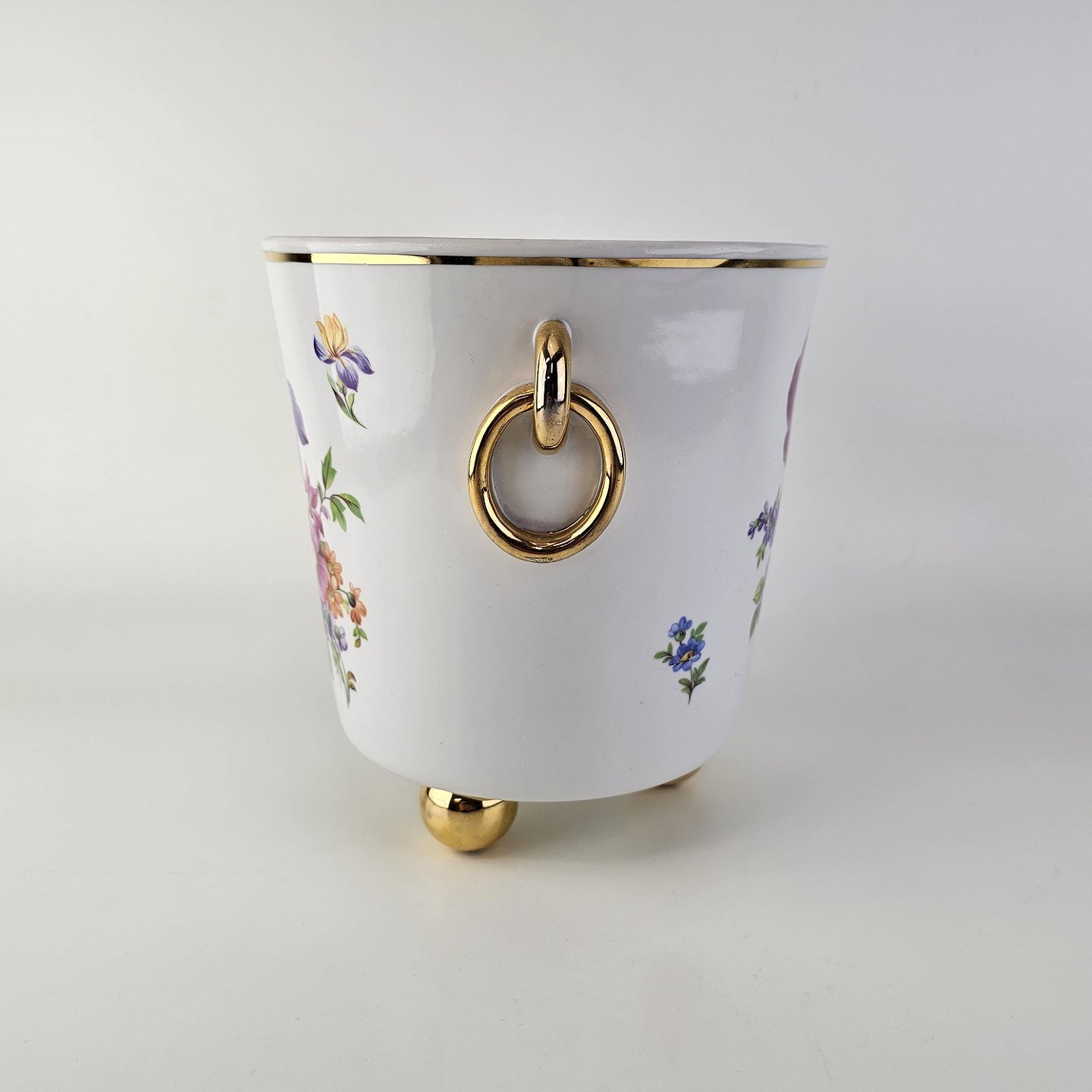 Urtepotteskjuler i porcelæn med farverigt blomstermotiv med tre guldbelagt kuglefødder og to guldbelagt hanke,