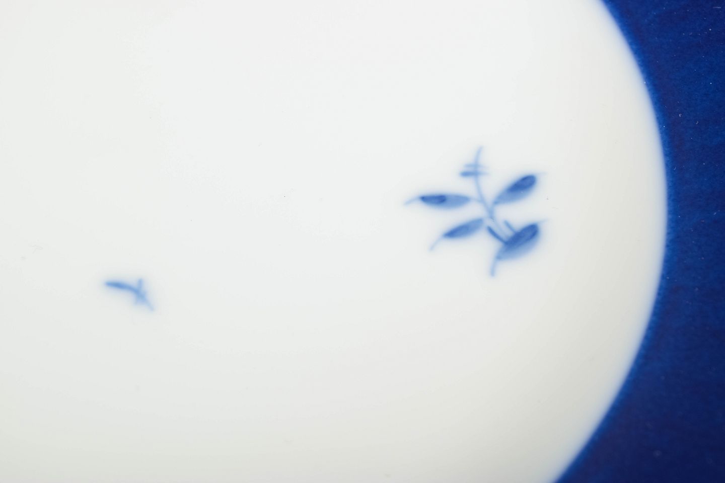 Sjældne, store tallerkener i porcelæn med bred dybblå kant og håndmalede blomsterdetaljer i klassisk Royal Copenhagen-stil. Et elegant og tidløst stel fra 50’erne, eftertragtet for sit rene formsprog og sin harmoniske farvebalance.