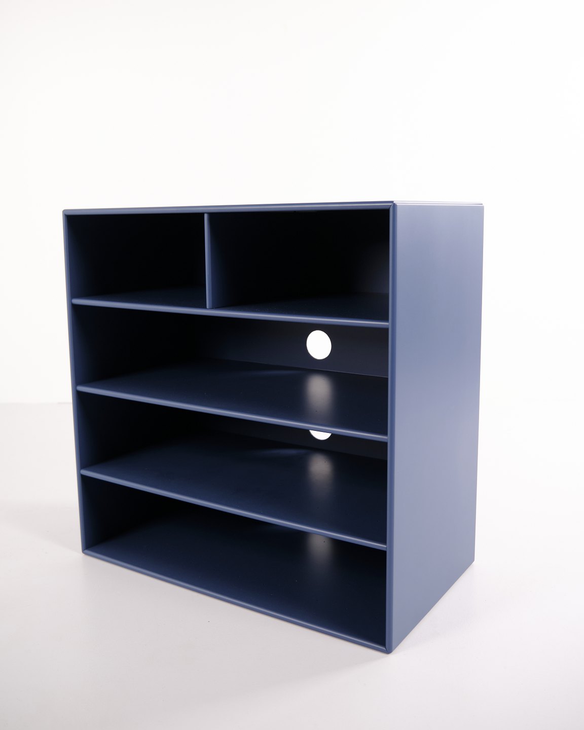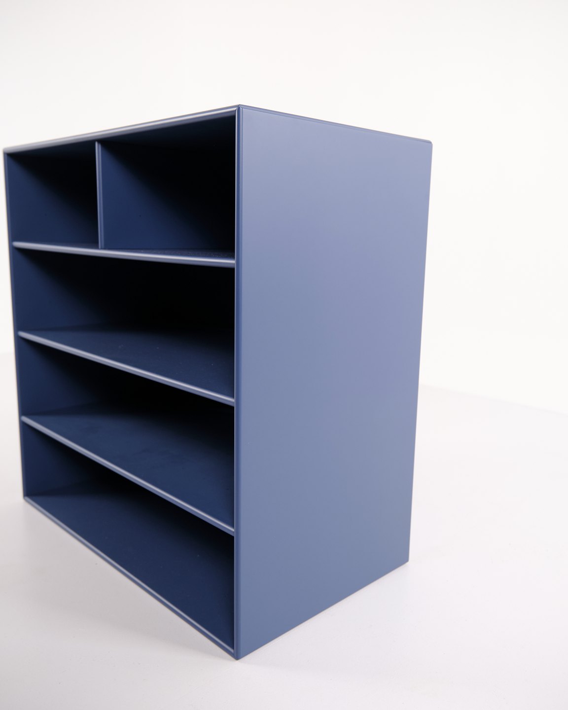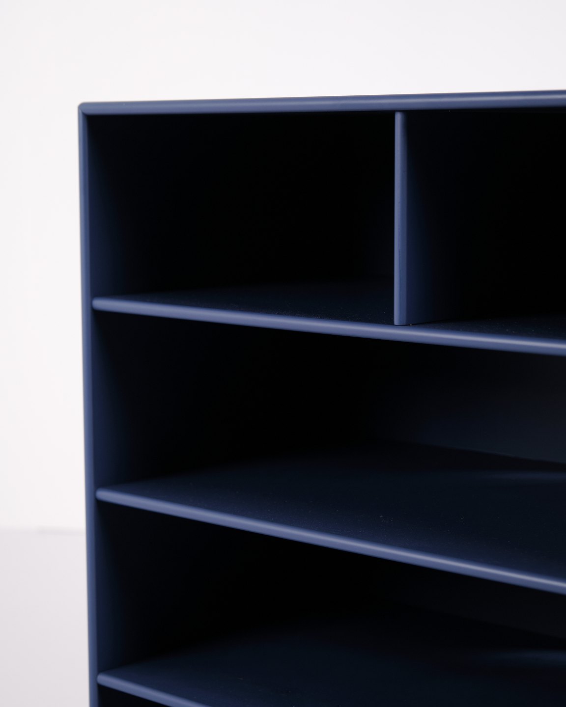 Montana reol i blå med krom ben. Udstyret med fire åbne hylder, velegnet til opbevaring eller udstilling i stue, kontor eller entré. Et klassisk Montana-modul med enkel opbygning og høj funktionalitet.