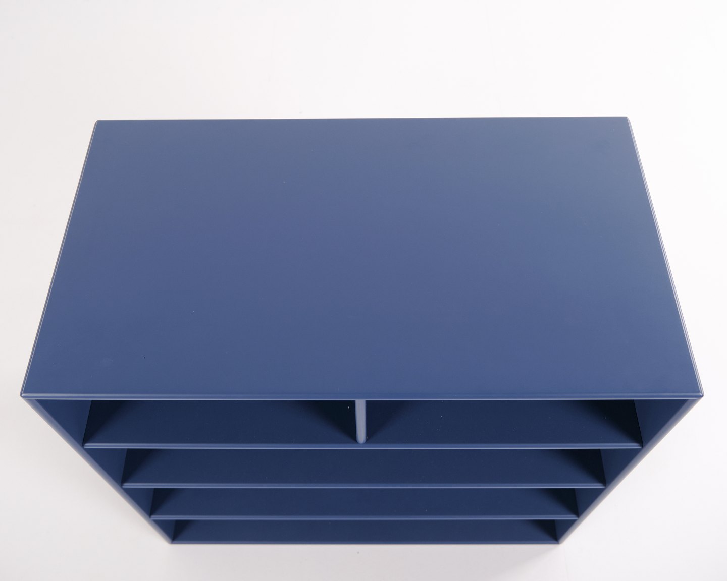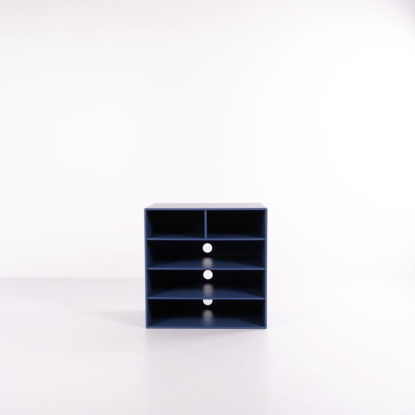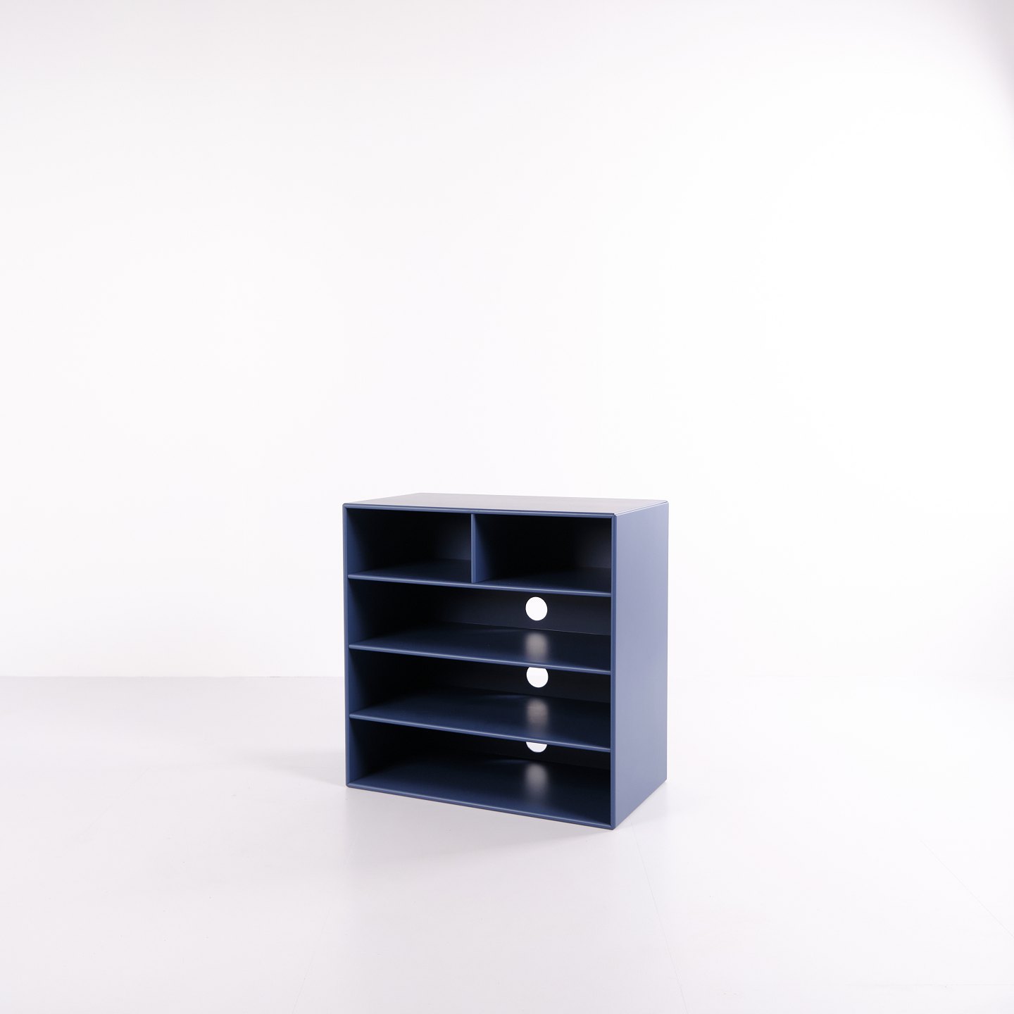 Montana reol i blå med krom ben. Udstyret med fire åbne hylder, velegnet til opbevaring eller udstilling i stue, kontor eller entré. Et klassisk Montana-modul med enkel opbygning og høj funktionalitet.