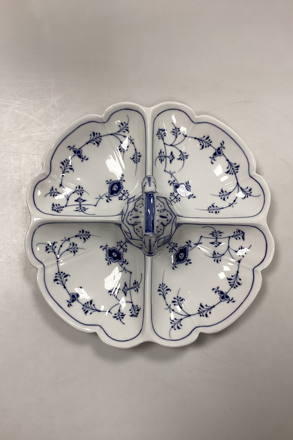 Royal Copenhagen Musselmalet Riflet Kabaretfad No. 396. Fire ruminddelinger og hank. 1. Sortering.