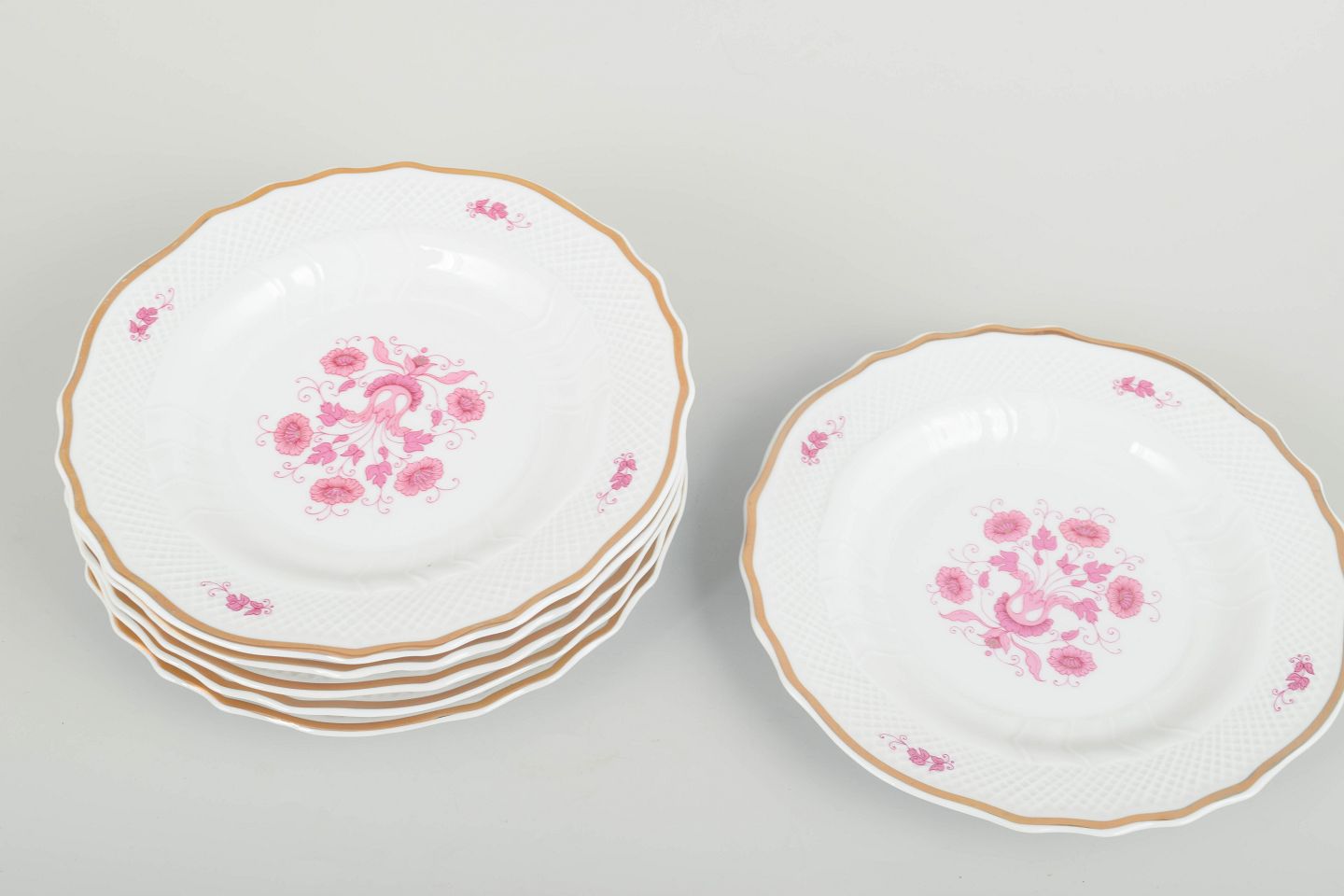 Sæt med seks fine tallerkener i porcelæn med lyserød blomsterdekoration og guldkant. Klassisk og elegant udførelse fra den ungarske porcelænsfabrik Hollóháza.