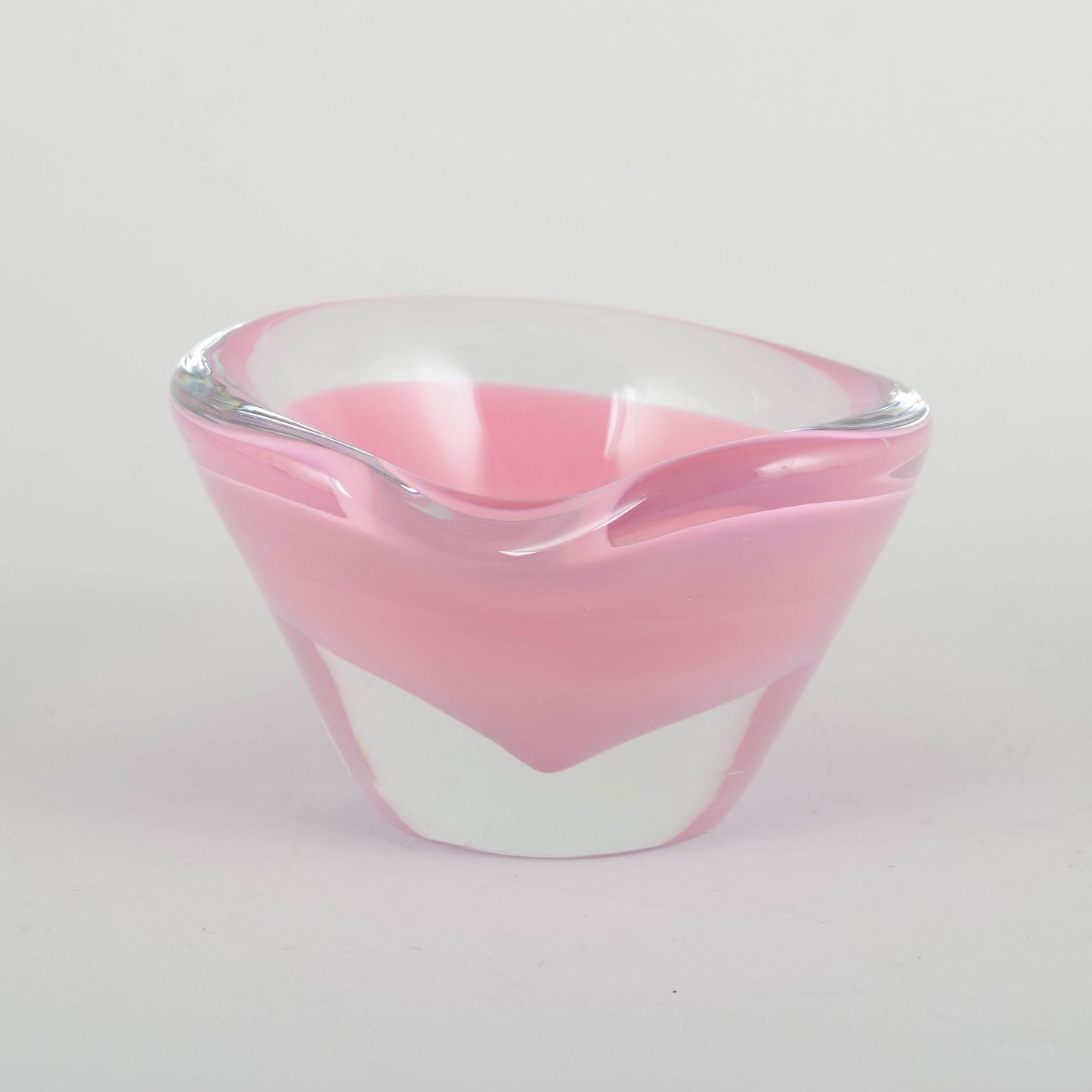 Lille, organisk formet skål i mundblæst glas med klar kant og lagdelt farvespil i rosa og hvidt, typisk for Murano glas fra perioden.