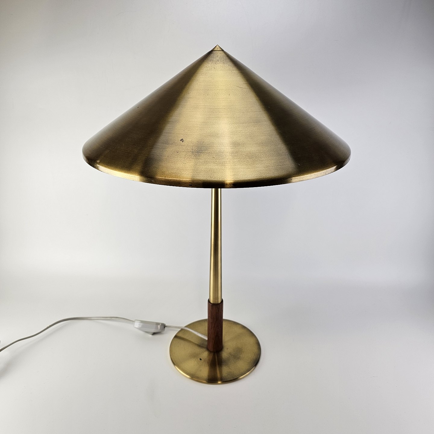 Bordlampe i messing med detalje af teak